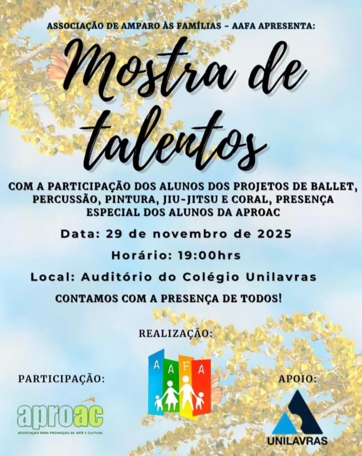 A Associação de Amparo as Famílias (AAFA), através da Associação para Promoção de Arte e Cultura (APROAC), realiza no próximo sábado, 29, a Mostra de Talentos. O evento vai contar com apresentações dos projetos sociais de ballet, precursão, pintura, jiu-jitsu e coral.