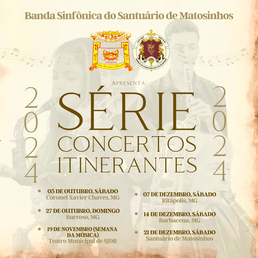 A Banda Sinfônica do Santuário do Senhor Bom Jesus de Matosinhos deu início neste mês de outubro a Série de Concertos Itinerantes com apresentações em cidades da região. Coronel Xavier Chaves e Barroso já foram contemplada com a visita dos musicistas. A programação segue até o mês de dezembro e deve passar, ainda, nas cidades de Barbacena e Ritápolis, além das apresentações em São João del-Rei.