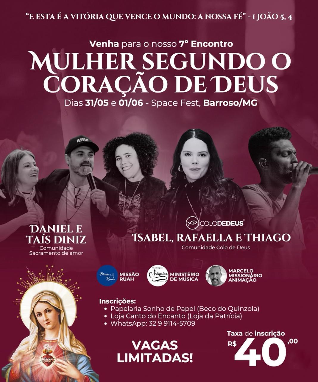 A cidade de Barroso recebe entre os dias 31 de maio e 01º de junho, a 7ª edição do encontro “Mulheres Segundo o Coração de Deus”. O evento acontece no Space Fest, com diversas participações especiais. As vagas são limitadas e a taxa para participação é de R$40.