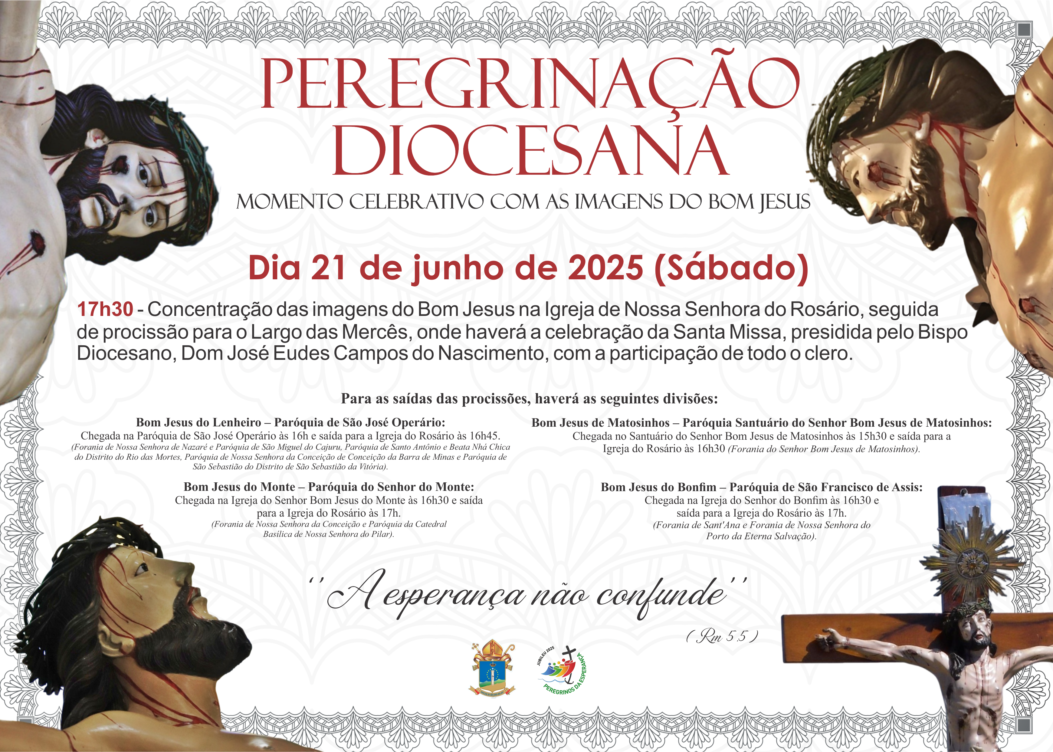Em um Ano Jubilar, a peregrinação representa um elemento-chave, como indica a bula papal “Spes non confundit”, referente ao Jubileu Ordinário de 2025: “Não é por acaso que a peregrinação representa um elemento fundamental de todo o evento jubilar. Pôr-se a caminho é típico de quem anda à procura do sentido da vida” (cf. n.5). Pensando nisso, a Diocese de São João del-Rei vai realizar no dia 21 de junho uma “Peregrinação Diocesana”, através de um momento celebrativo com as imagens devocionais do Senhor Bom Jesus: Matosinhos, Bonfim, Lenheiro e do Monte.