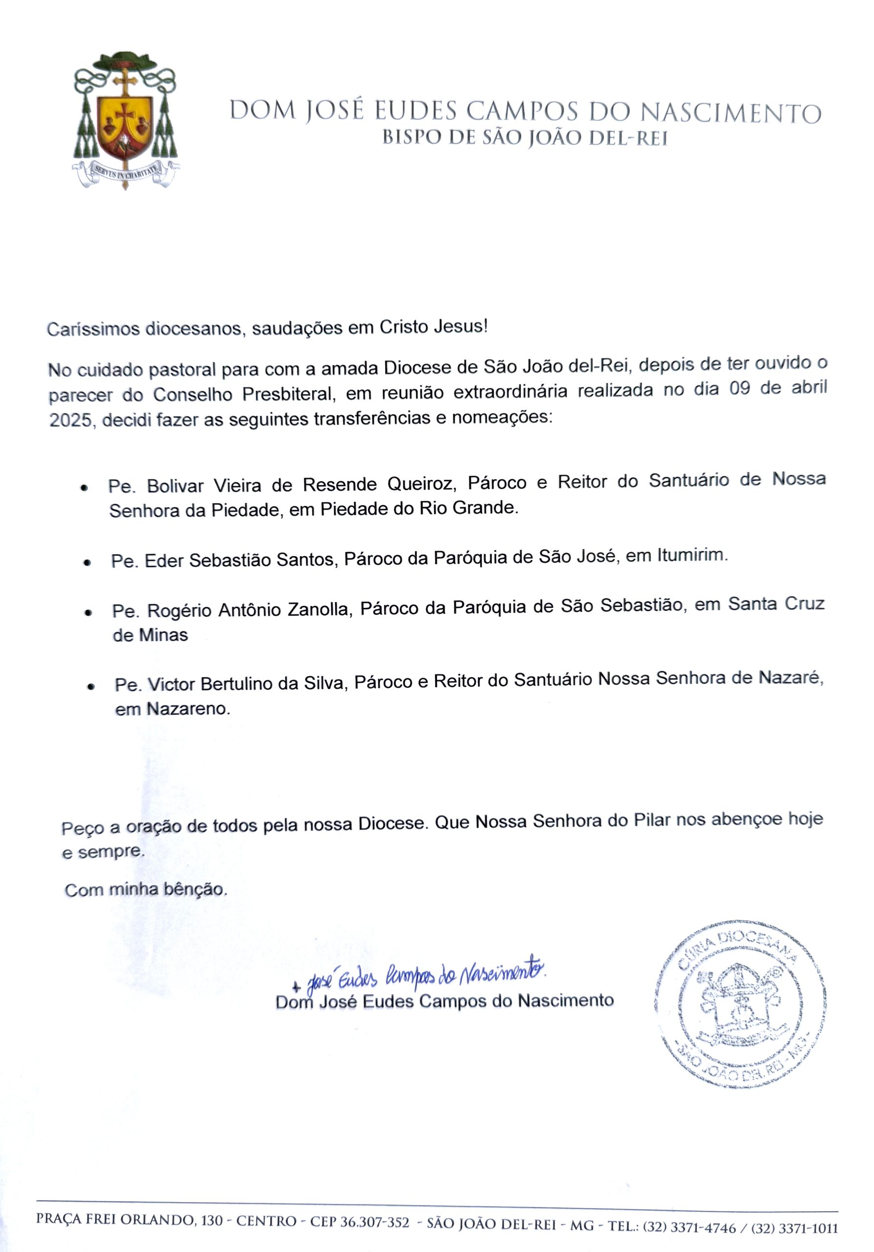 No cuidado pastoral para com a amada Diocese de São João del-Rei, depois de ter ouvido o parecer do Conselho Presbiteral, em reunião extraordinária realizada no dia 09 de abril 2025, decidi fazer as seguintes transferências e nomeações: