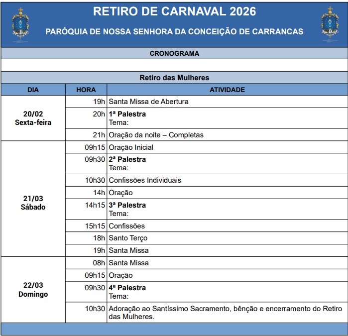 Na Paróquia Nossa Senhora da Conceição, na cidade de Carrancas vai acontecer o 83º Retiro Espiritual de Carnaval para Homens e o 40º para mulheres. O evento vai ter início na sexta-feira, 13, e segue até domingo, 15. Uma opção para quem deseja se afastar do barulho e buscar algum diferencial, na presença de Deus.