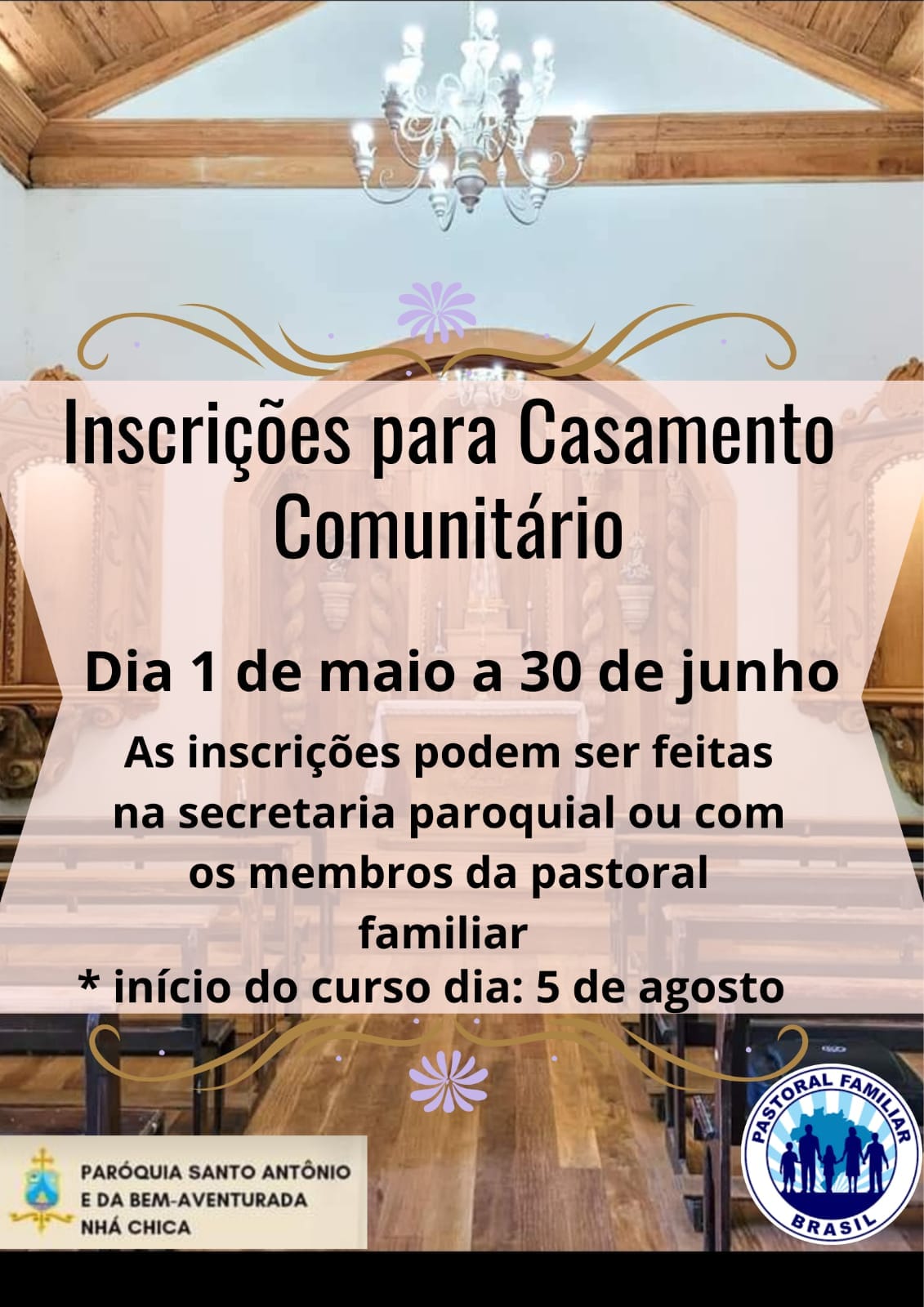 Começaram no dia -1º de maio as inscrições para o projeto do casamento comunitário, promovida pela Pastoral Familiar. Os interessados terão até o fim do mês de junho para garantir participação. Podem se inscrever os casais, sem impedimentos, que vivem em União Estável, pertencente ou não, à Paróquia. A preparação para os noivos vai acontecer a partir do dia 05 de agosto. A cerimônia tem data prevista para o dia 18 de novembro de 2023.