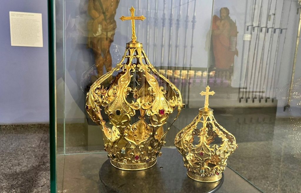 Tendo a Virgem do Pilar protegido os são-joanenses desde que se formava o primitivo arraial minerador, nada mais apropriado que a coroa oferecida à Mãe de Deus fosse produzida com ouro coletado das encostas das serras da cidade. O símbolo da realeza divina foi feita com ouro são-joanense e de pedras preciosas mineiras. Atualmente são usadas nas imagens apenas nas grandes solenidades, permanecendo no Museu de Arte Sacra, durante todo o ano, para visitação.