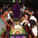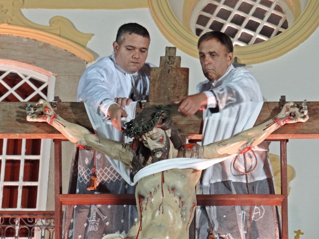 A lua já seguia alta quando, aos poucos, placa, coroa de espinhos e cravos eram retirados da imagem de Cristo na cruz. Interpretando José de Arimatéia e Nicodemos, os padres Geraldo Magela e Ramiro Gregório retiravam os objetos no comando do pregador.