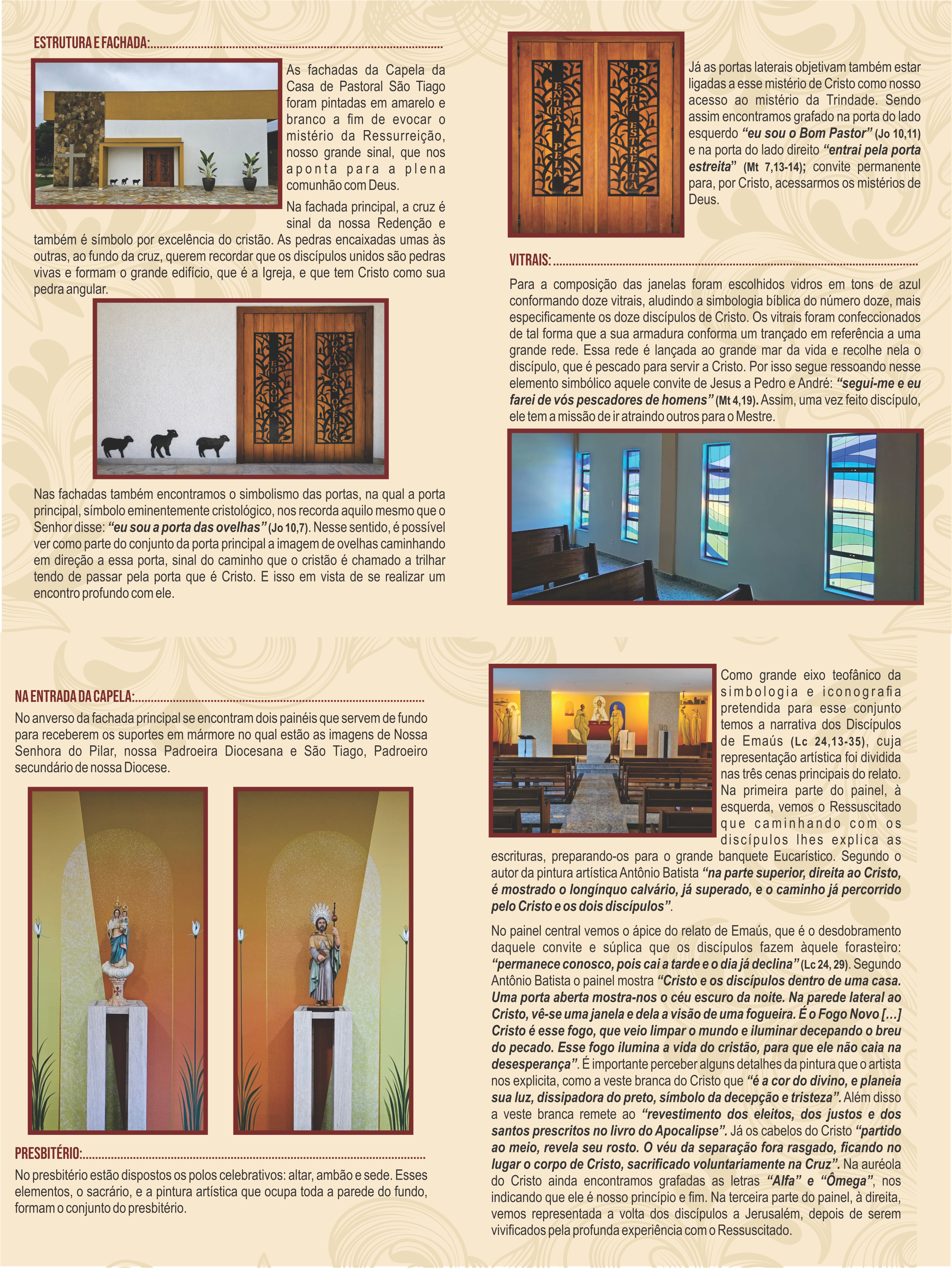 A capela se destaca pela beleza artística e simbólica. O ambiente recebeu pintura de Antônio Batista, artista brasileiro de inspiração iconográfica, que retrata a cena bíblica dos Discípulos de Emaús. Suas obras, presentes em diversas igrejas do país, também podem ser apreciadas na Igreja Matriz de São José Operário, em São João del-Rei. A nova Casa de Pastoral São Tiago nasce, assim, como espaço de comunhão, formação e envio missionário, destinada a fortalecer a vida pastoral e evangelizadora da Diocese de São João del-Rei, respondendo aos desafios do tempo presente com renovado ardor e esperança.