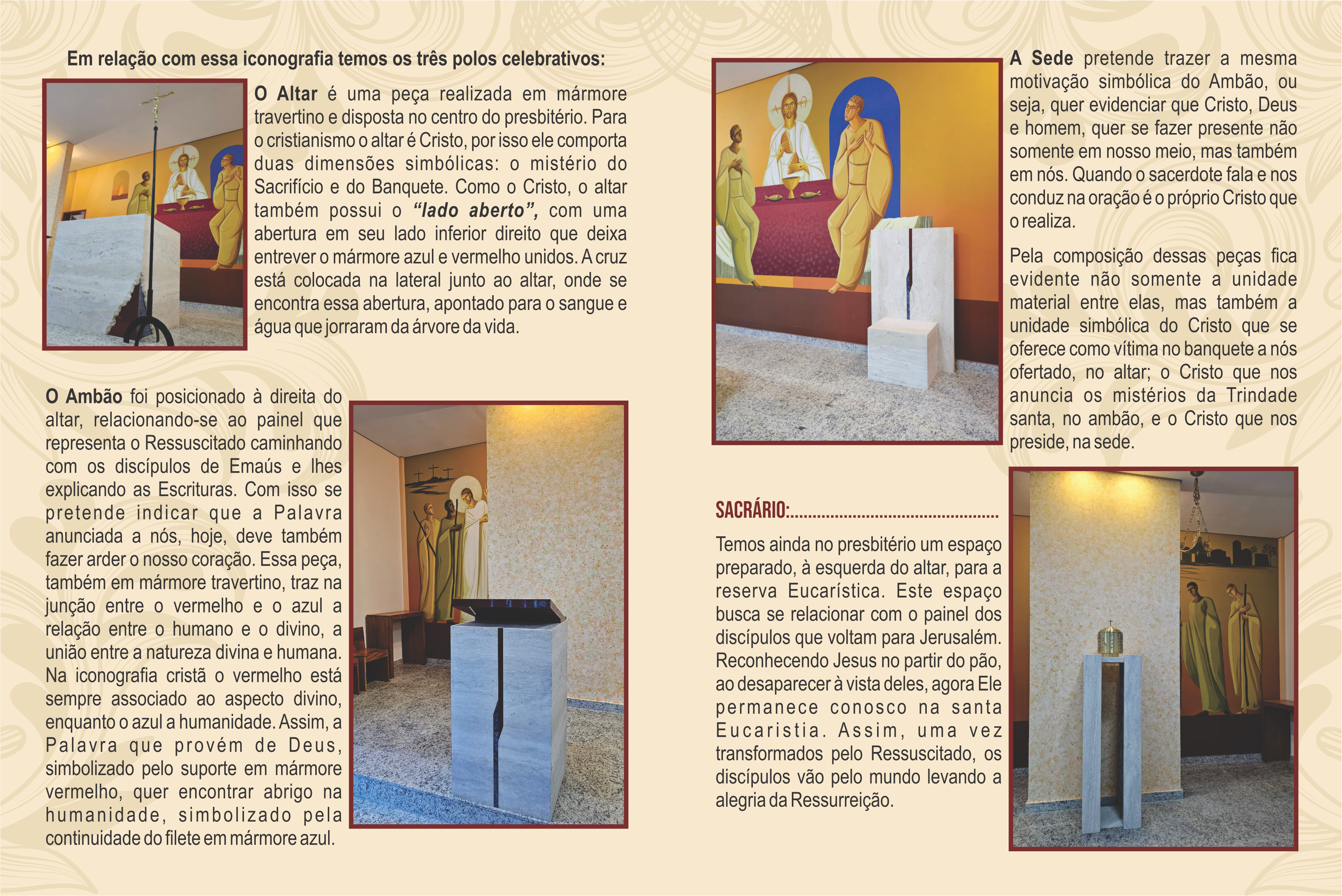 “No primeiro painel é possível ver o Ressuscitado caminhando com os discípulos e lhes explicando as escrituras. No painel central está Cristo que parte o pão e se dá nele. Convite para aprendermos a reconhecê-lo no partir do pão de cada Santa Eucaristia. No último painel encontramos os discípulos que voltam a Jerusalém para levar a alegre notícia do encontro com o Senhor”, destaca.