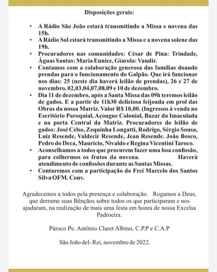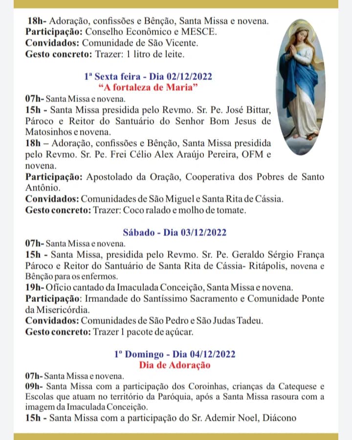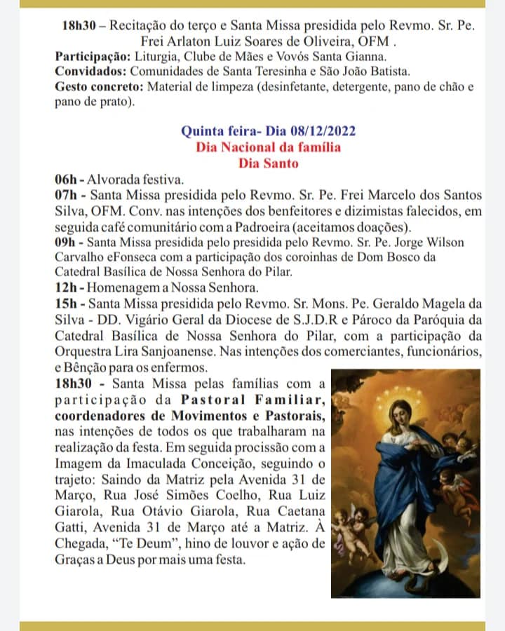 “Maria é a cheia de Graça, a mulher amada por Deus e agraciada pelo privilegio de ser isenta do pecado para poder, assim, participar de forma total e decisiva como serva disponível e obediente do plano de salvação. A Virgem Imaculada é modelo para nossas comunidades na vivencia do compromisso com o Senhor, sobretudo nesse tempo de advento. Ela nos incentiva a gerar Cristo, torná-lo evidente no nosso dia à dia”, pontou Dom José Eudes Nascimento, bispo diocesano de São João del-Rei.