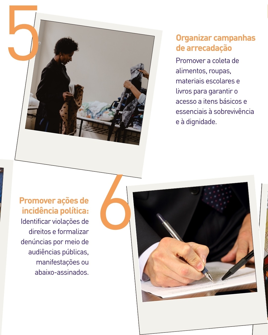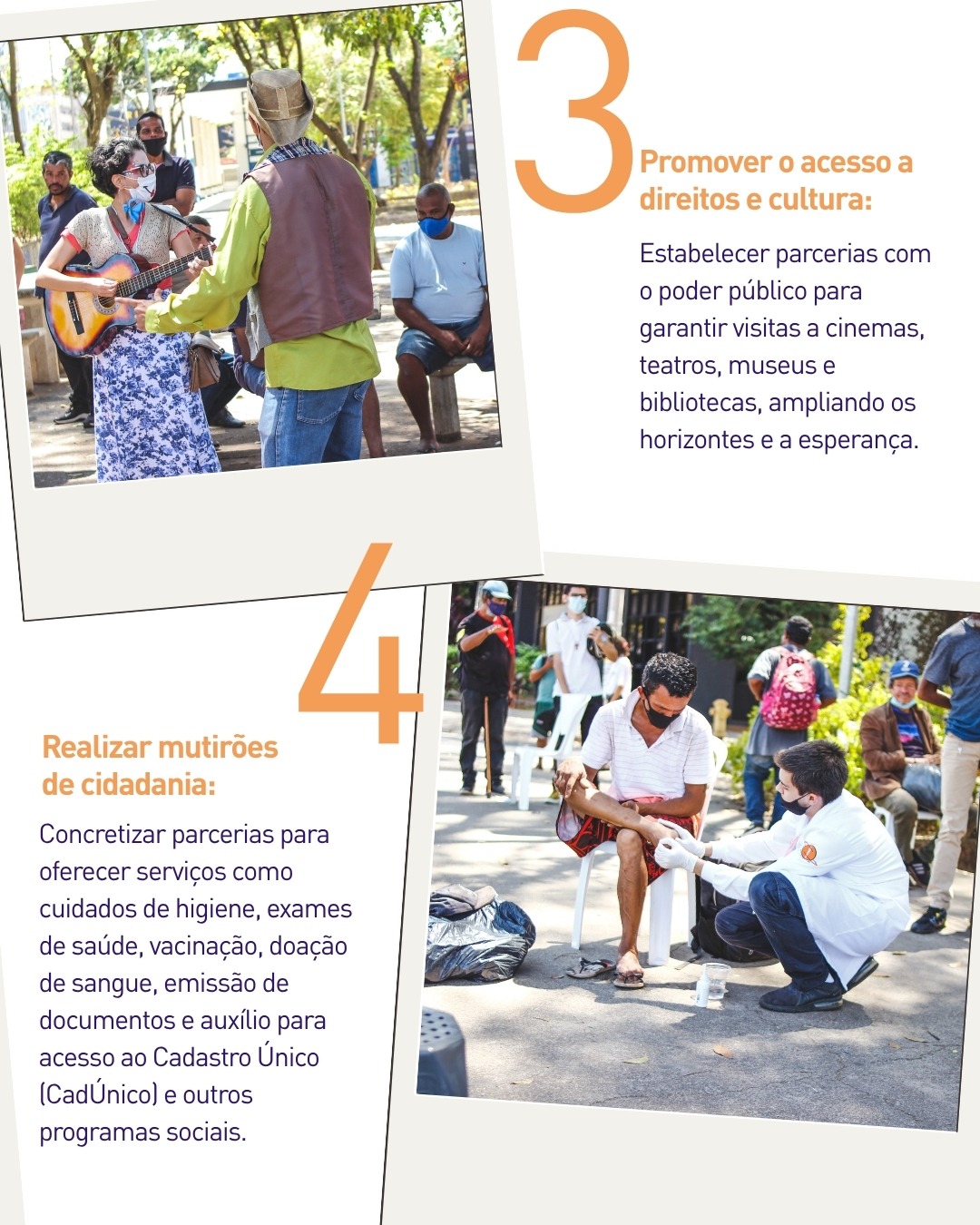 Também se propõe promover o acesso à cultura e aos direitos, por meio de parcerias com o poder público, possibilitando visitas a cinemas, teatros, museus e bibliotecas. A realização de mutirões de cidadania, oferecendo serviços de saúde, higiene, vacinação e emissão de documentos, é outro gesto concreto de cuidado e inclusão. A solidariedade pode ainda ser expressa por meio da organização de campanhas de arrecadação de alimentos, roupas e materiais escolares. Além disso, é importante promover ações de incidência política, identificando violações de direitos e encaminhando denúncias ou propostas por meio de audiências públicas e mobilizações sociais.