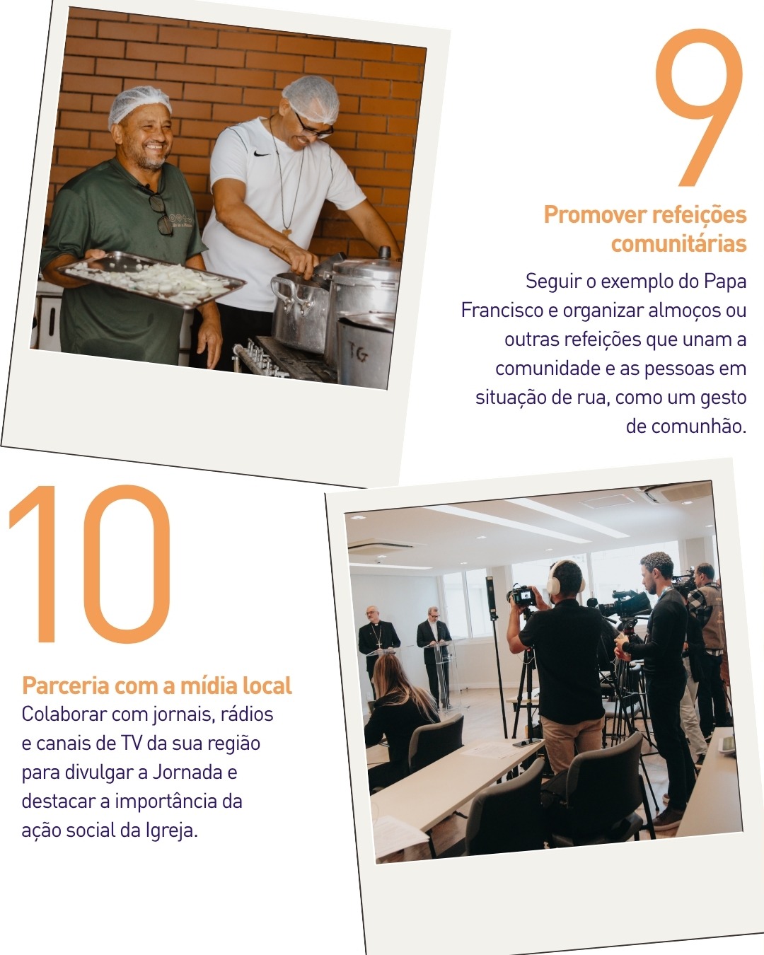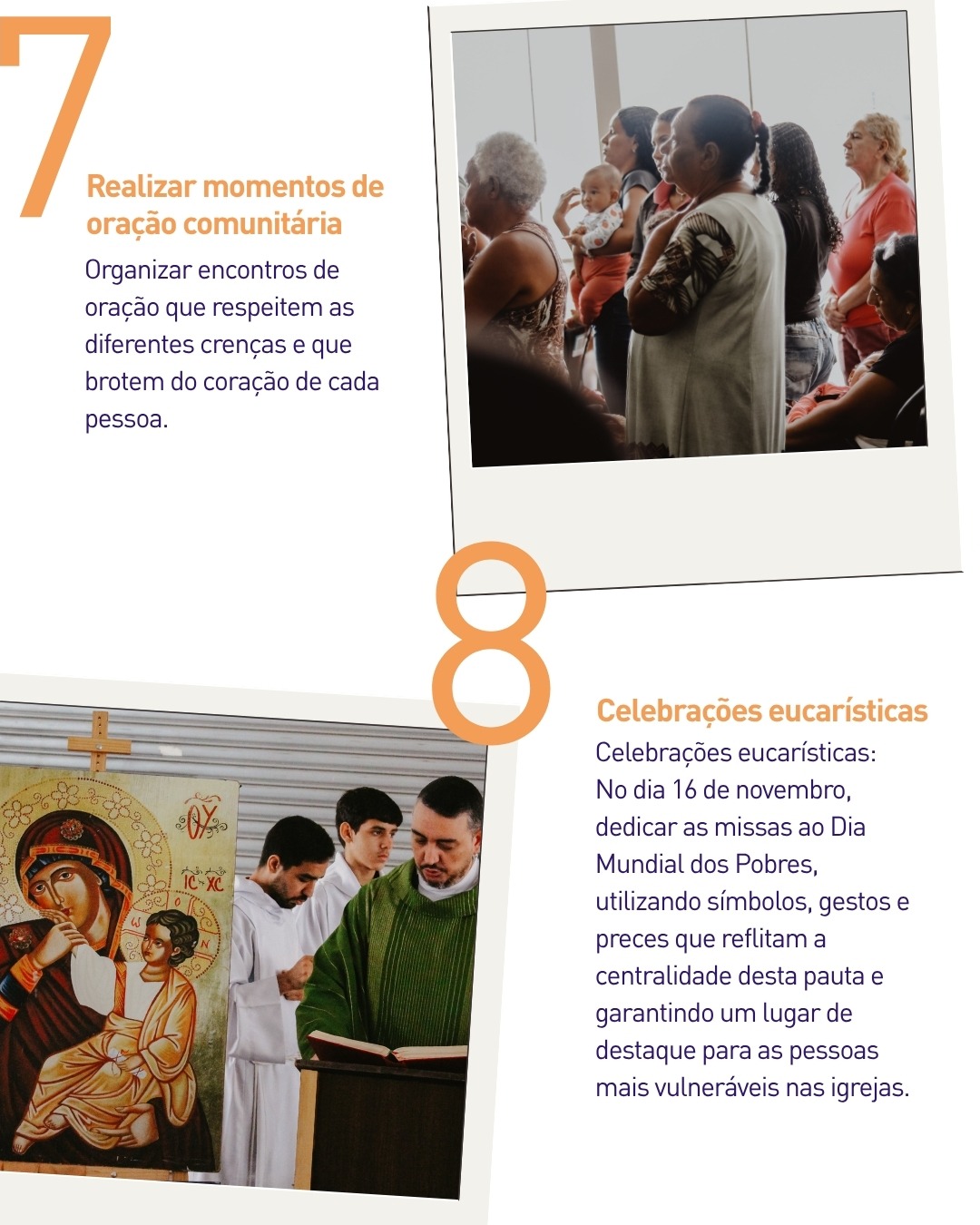 A Jornada também é um tempo oportuno para realizar momentos de oração comunitária, respeitando as diferentes crenças, e celebrações eucarísticas dedicadas ao Dia Mundial dos Pobres, no dia 16 de novembro, com gestos e símbolos que deem centralidade aos mais vulneráveis. Outras duas ações recomendadas são promover refeições comunitárias, inspiradas no gesto do Papa Francisco de partilhar a mesa com pessoas em situação de rua, e estabelecer parcerias com a mídia local para divulgar as iniciativas da Jornada e fortalecer a cultura da solidariedade.