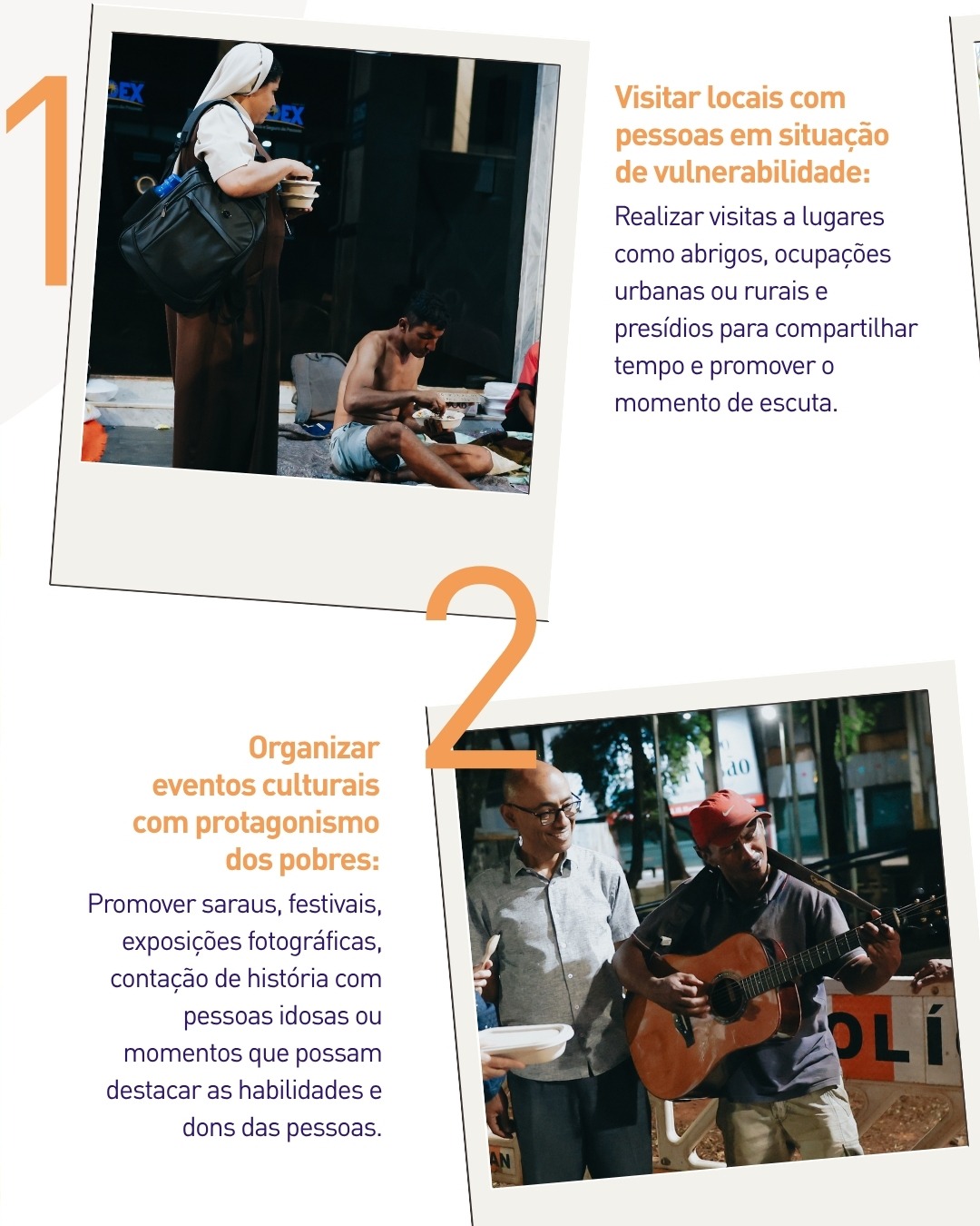 A 9ª Jornada Mundial dos Pobres, convocada pelo Papa Leão XIV, é um convite a transformar a fé em ação e a redescobrir o valor da fraternidade. Para apoiar esse caminho, foram reunidas dez sugestões de ações que podem ser desenvolvidas nas paróquias, movimentos, escolas e comunidades de fé em todo o Brasil. Entre as propostas está visitar locais com pessoas em situação de vulnerabilidade, como abrigos, ocupações urbanas ou rurais e presídios. Esses encontros favorecem o diálogo, o escuta e o fortalecimento de vínculos humanos e espirituais. Outra sugestão é organizar eventos culturais com protagonismo dos pobres, como saraus, festivais, contações de histórias e exposições fotográficas que valorizem talentos e experiências de vida.