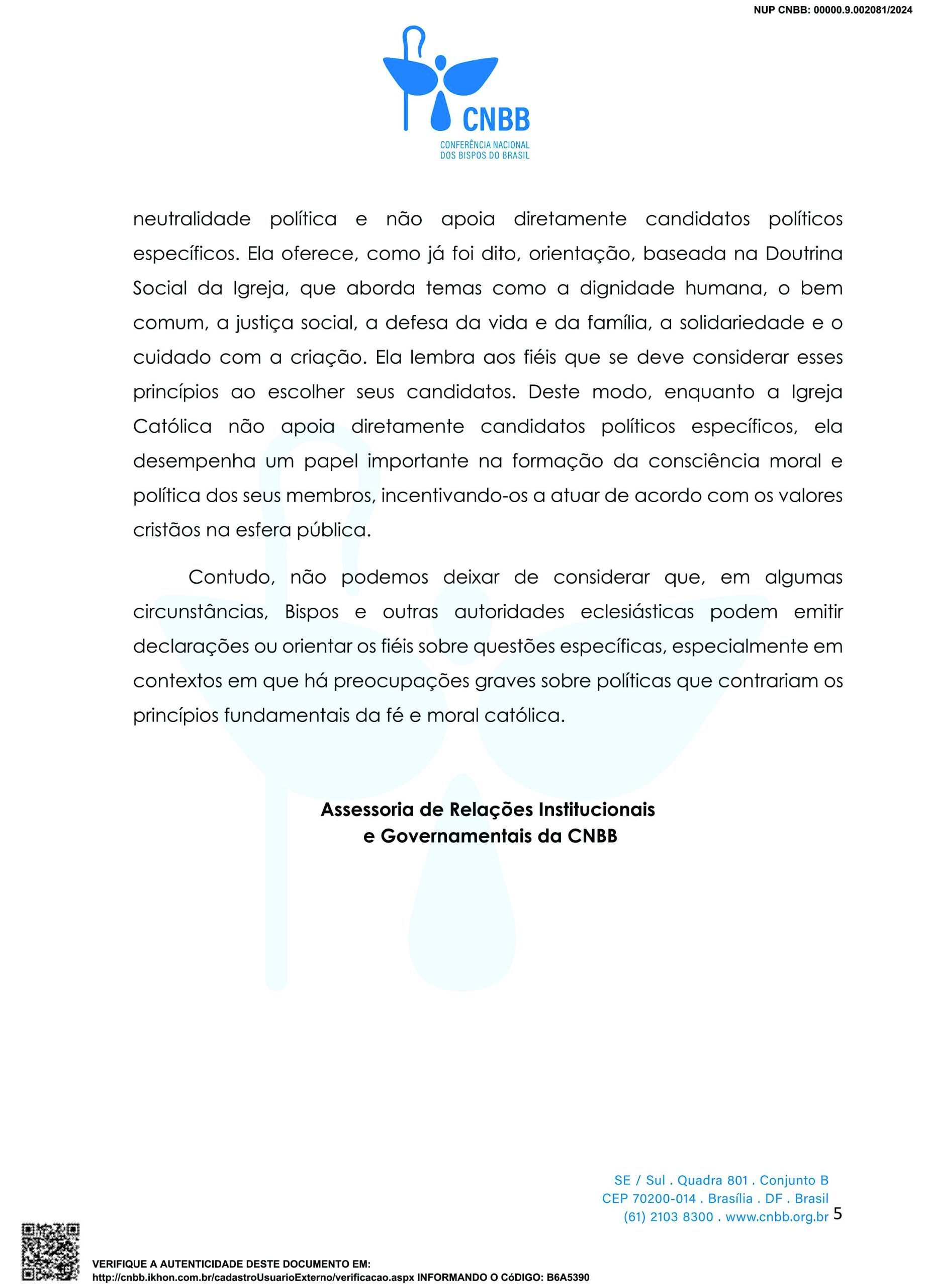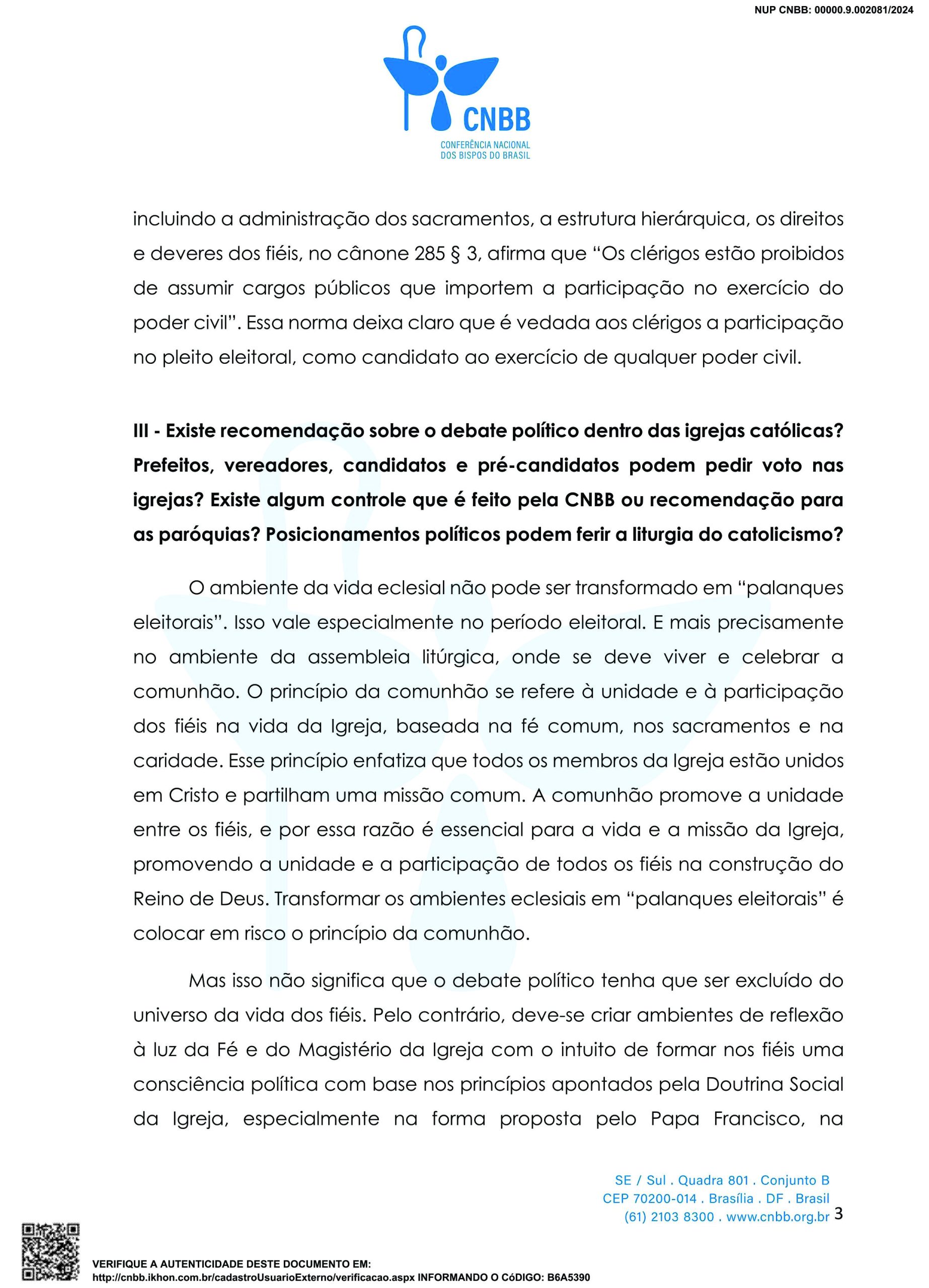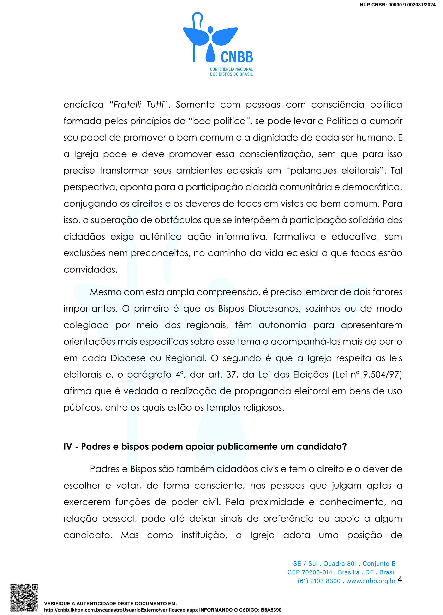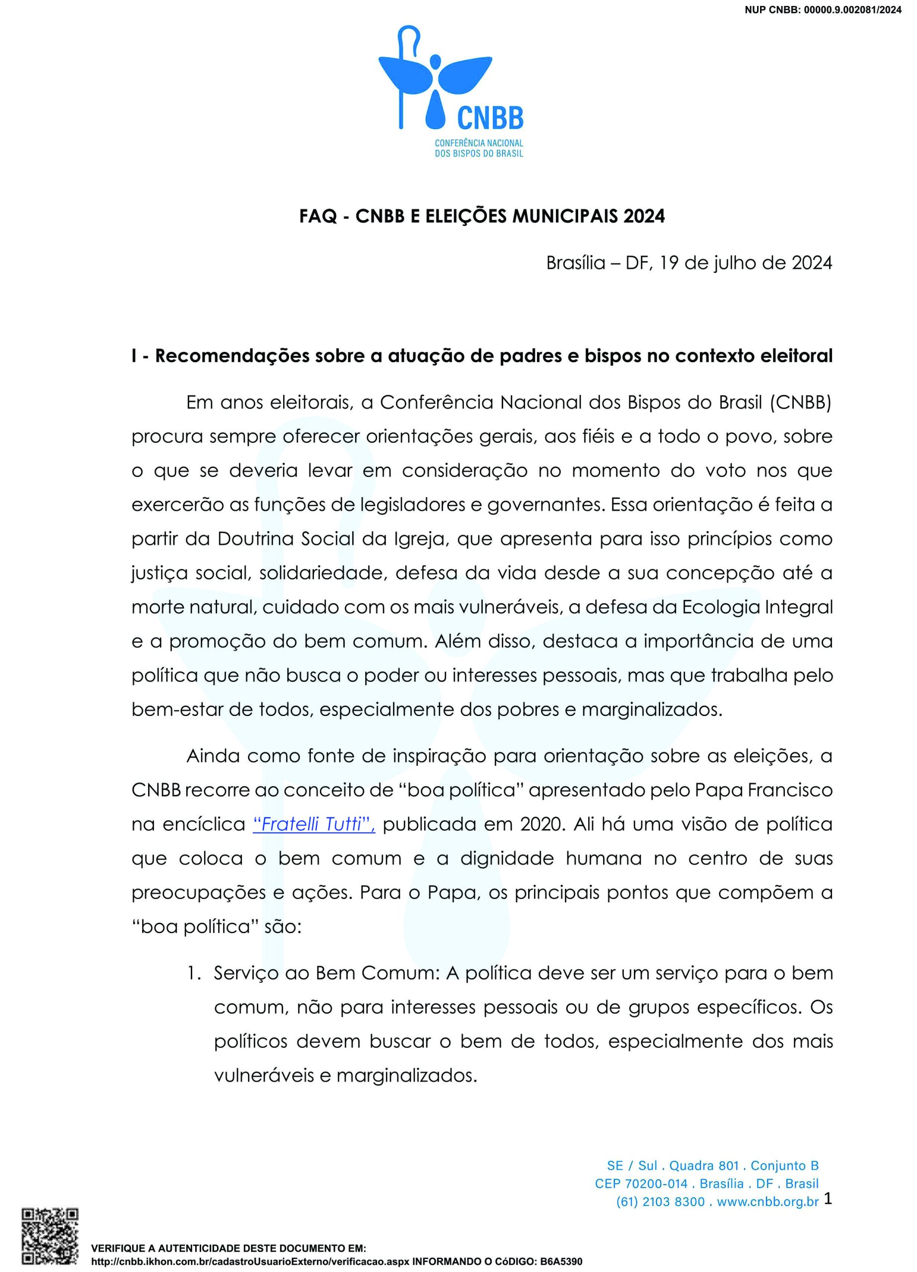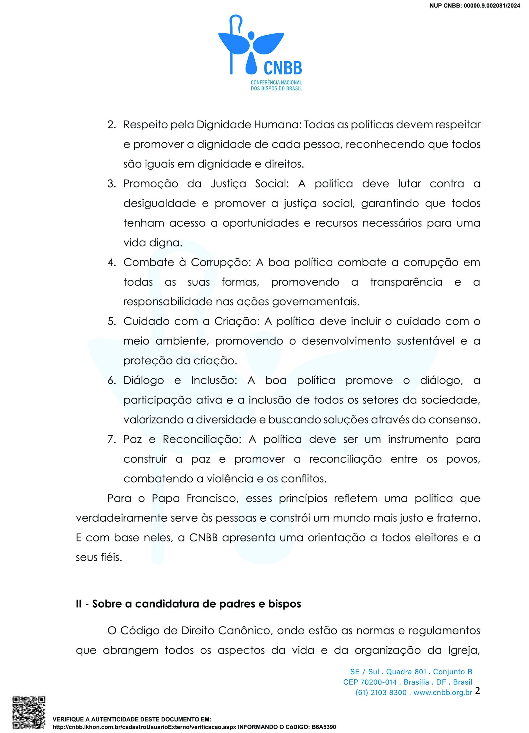 Os outros pontos abordam a candidatura de padres e bispos, o debate político dentro das Igrejas Católicas e o pedido de votos nas celebrações e sobre o apoio de padres e bispos a candidatos.