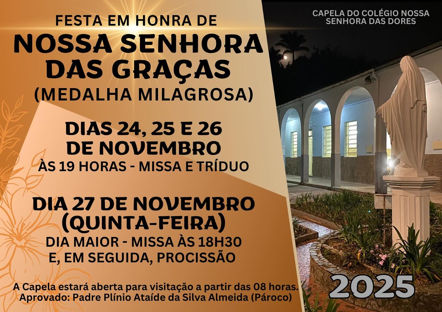 Tem início hoje, 24, as festividades em honra à Nossa Senhora das Graças ou Medalha Milagrosa no Colégio Nossa Senhora das Dores, em São João del-Rei. Uma devoção de origem no século XIX, com uma história de quase 200 anos, que perpetua até hoje. São muitos os devotos que carregam com sigo a medalha e o amor ao título mariano.