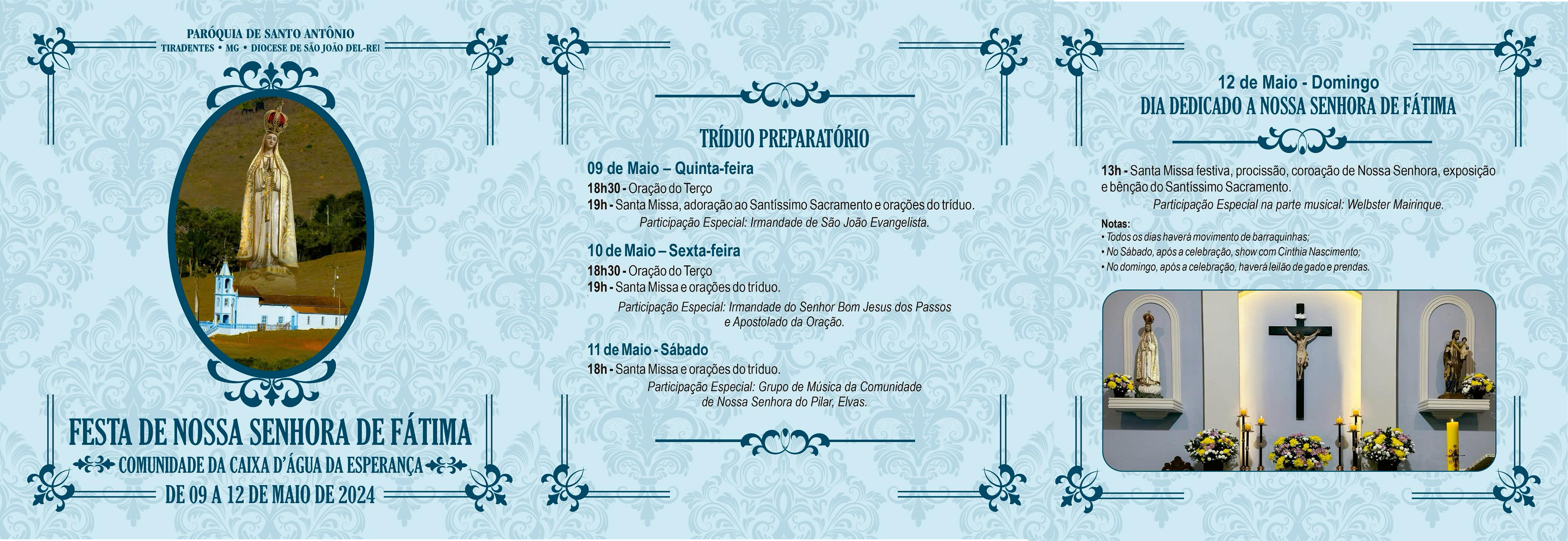 Quase 10km da histórica cidade de Tiradentes, a Comunidade da Caixa d’Água da Esperança, pertencente a Paróquia Santo Antônio, inicia nesta quinta-feira, dia 09 de maio, as festividades em honra a Nossa Senhora de Fátima.