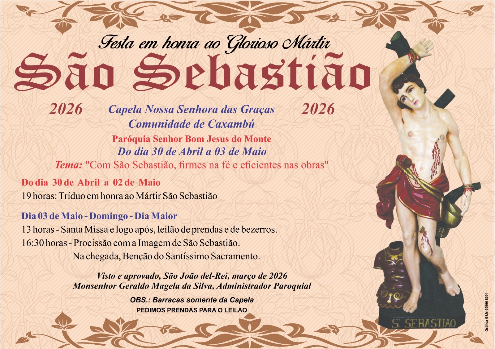 A Comunidade de Caxambu, pertencente à Paróquia Senhor Bom Jesus do Monte, em São João del-Rei, já vive o clima de fé e devoção com a realização da tradicional festa em honra a São Sebastião. O evento vai acontecer entre os dias 30 de abril e 3 de maio, reunindo fiéis de toda a região.