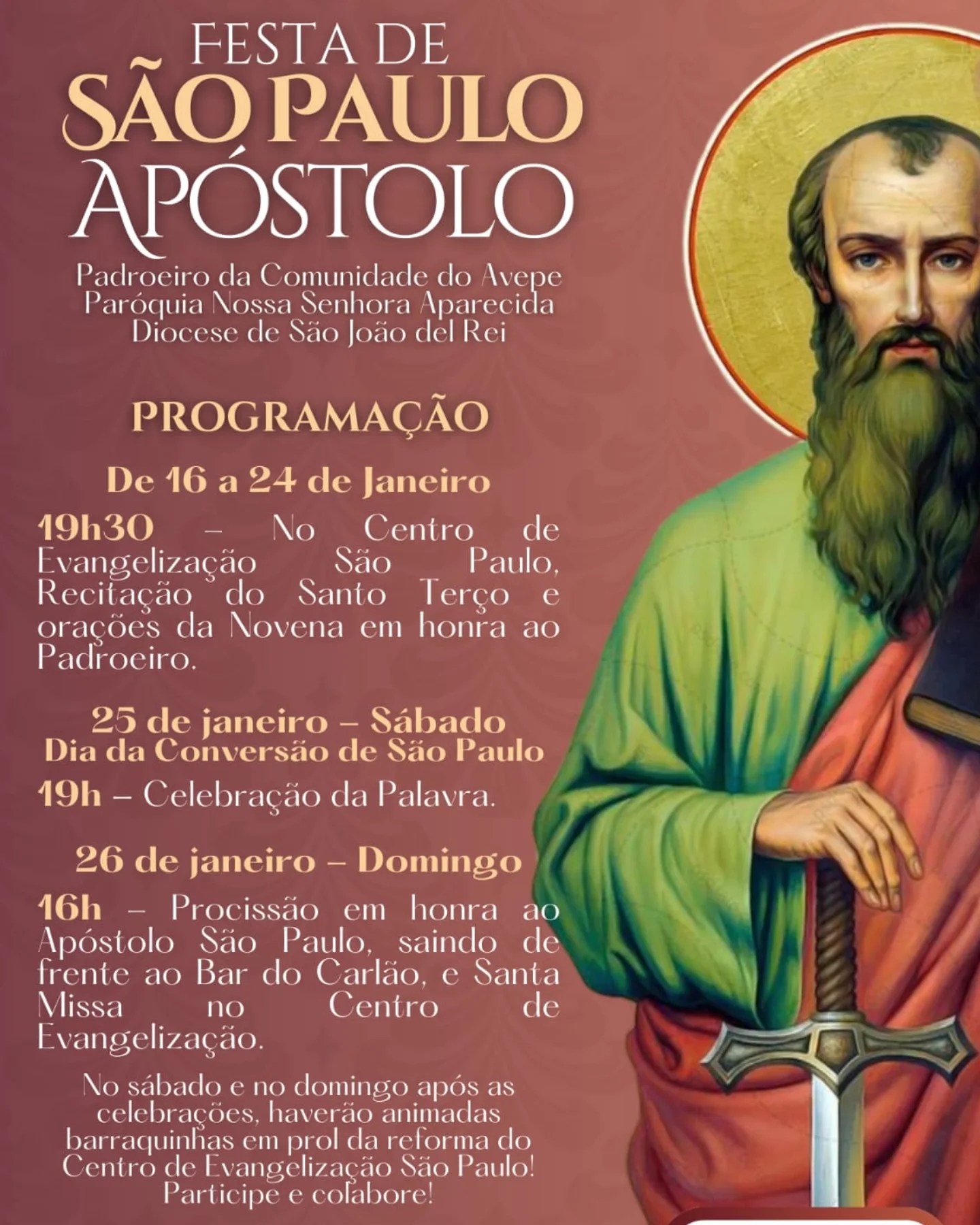 A Comunidade do Avepe, pertencente à Paróquia Nossa Senhora Aparecida, em lavras, vai dar início nesta quinta-feira, 16, as festividades em honra à São Paulo, Apostolo. A programação conta oração do terço e novena preparatória. O ápice da programação será no domingo, 26, com celebração de missa e procissão.