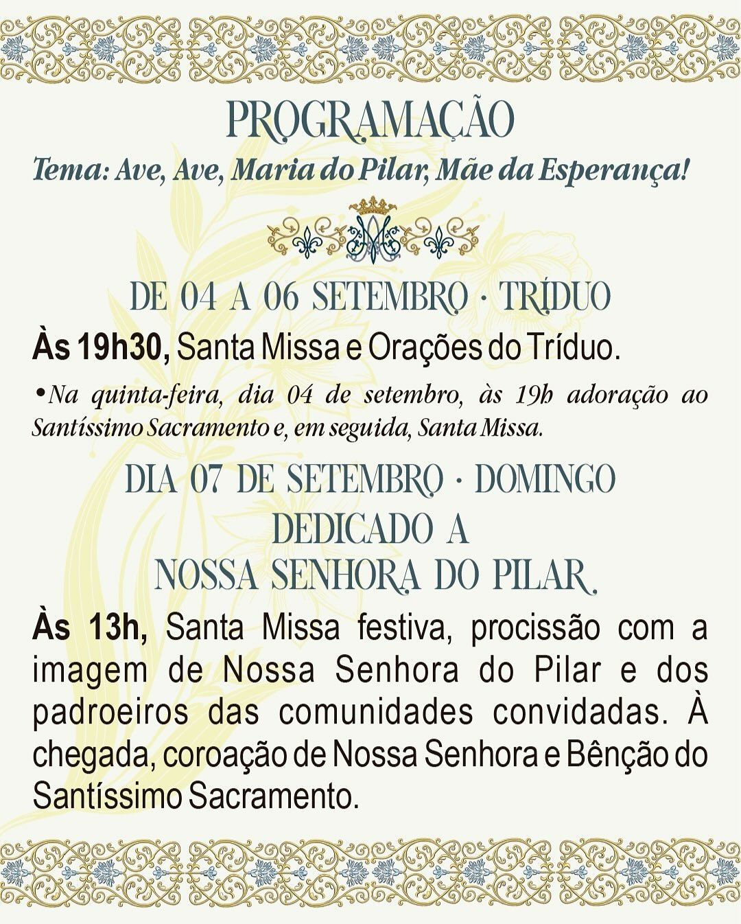 A Comunidade Rural do Elvas, pertencente a Paróquia Santo Antônio, da cidade de Tiradentes, festeja neste início de setembro sua padroeira, Nossa Senhora do Pilar. A programação tem início na quinta-feira, dia 04, com a realização do Tríduo Preparatório. O ápice da programação será no domingo, 07, véspera dia que a Igreja celebra a festa da Natividade de Nossa Senhora. No dia haverá missa festiva, procissão, coroação da imagem e bênção do Santíssimo Sacramento.