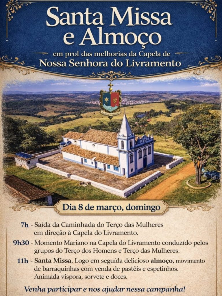A iniciativa busca mobilizar fiéis e moradores para contribuir com as melhorias da capela, fortalecendo a tradição religiosa e o espírito de colaboração da comunidade. A programação tem início às 07h, com a saída da Caminhada do Terço das Mulheres em direção à Capela do Livramento. Às 9h30, acontece o Momento Mariano, conduzido pelos grupos do Terço dos Homens e do Terço das Mulheres.