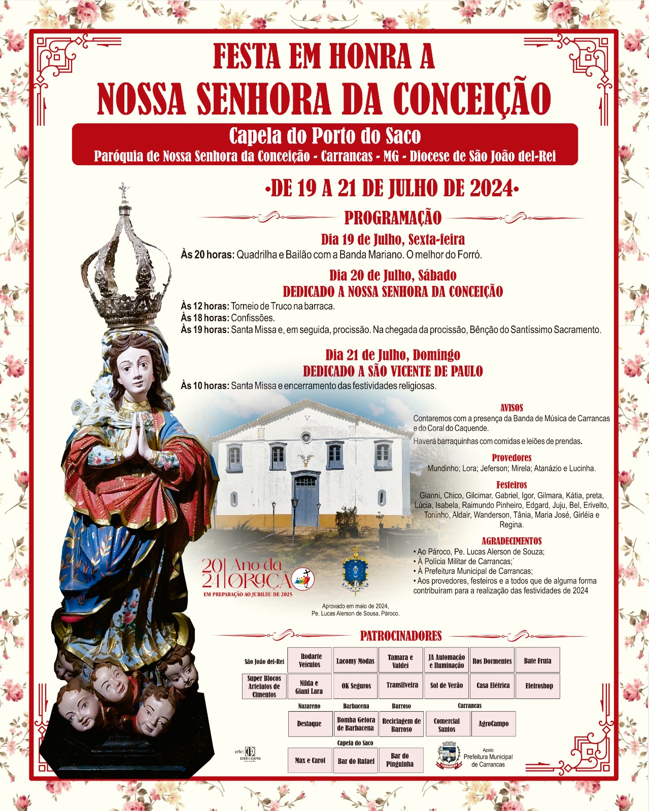 Têm início nesta sexta-feira, 19, a festa em honra a Nossa Senhora da Conceição, na Capela do Porto do Saco, em Carrancas. A programação se concentra no final de semana e conta com danças típicas, torneio de truco, atendimento de confissões, celebração de missa, procissão e bênção do Santíssimo Sacramento.