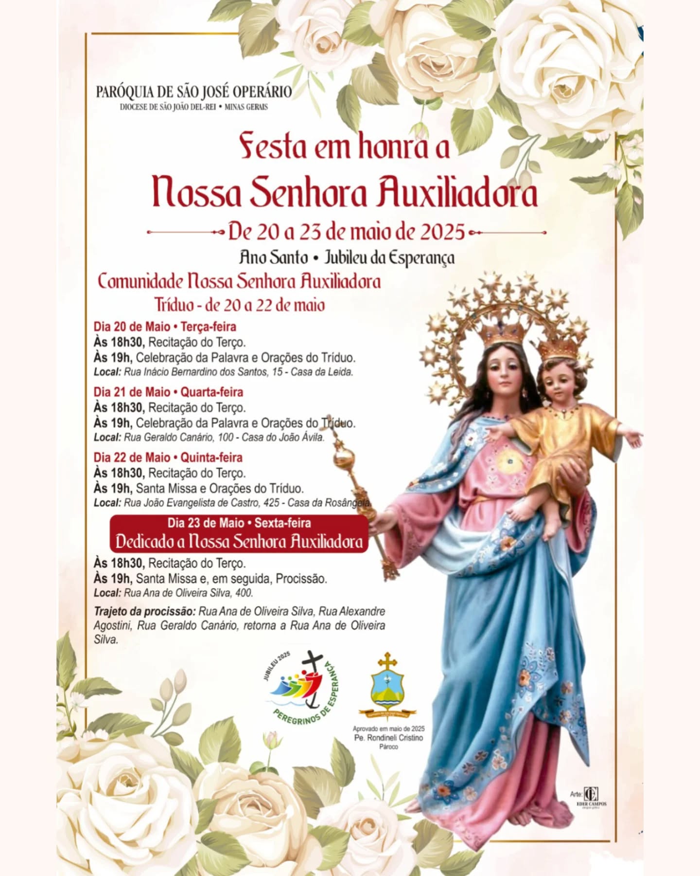Teve início nesta terça-feira, 20, a festa dedicada a Nossa Senhora Auxiliadora, na Paróquia São José Operário, em São João del-Rei. Até o dia 22 vai acontecer a recitação do terço, celebração da palavra ou missa e oração do tríduo. O ápice da programação será na sexta-feira, 23, com missa e procissão.