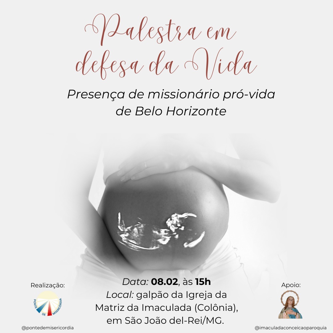 A Comunidade Ponte de Misericórdia, com o apoio da Paróquia da Imaculada Conceição, vai realizar no próximo sábado, 08, uma palestra de formação em Defesa da Vida. o evento vai acontecer às 15 horas, no galpão da paróquia da Imaculada Conceição, na Colônia do Marçal e vai contar com a presença de missionários do Movimento Pró-vida de Belo Horizonte/MG.