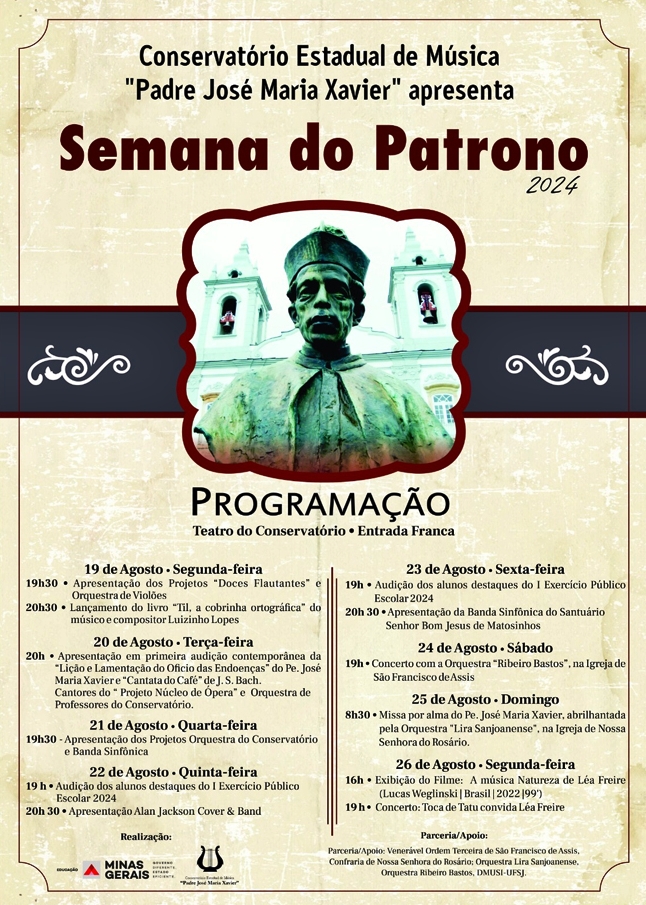 Até a próxima segunda-feira, 26 de agosto, acontece em São João del-Rei, a Semana do Patrono no Conservatório Estadual de Música Padre José Maria Xavier. Trata-se de uma festividade em comemoração à data de nascimento do religioso e compositor musical são-joanense que dá nome à mais tradicional escola de música da região das Vertentes. A programação especial conta com diversos concertos, lançamento de livro, exibição de filme e muito mais.