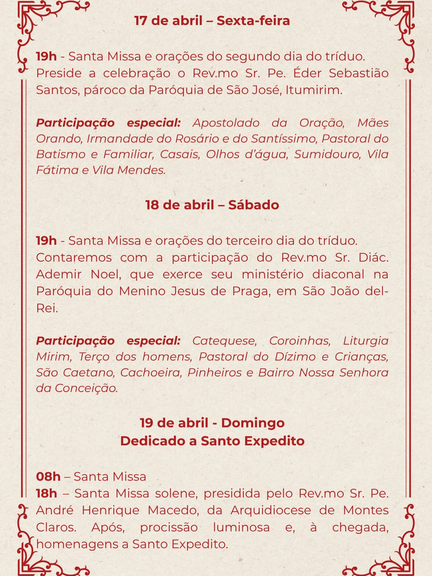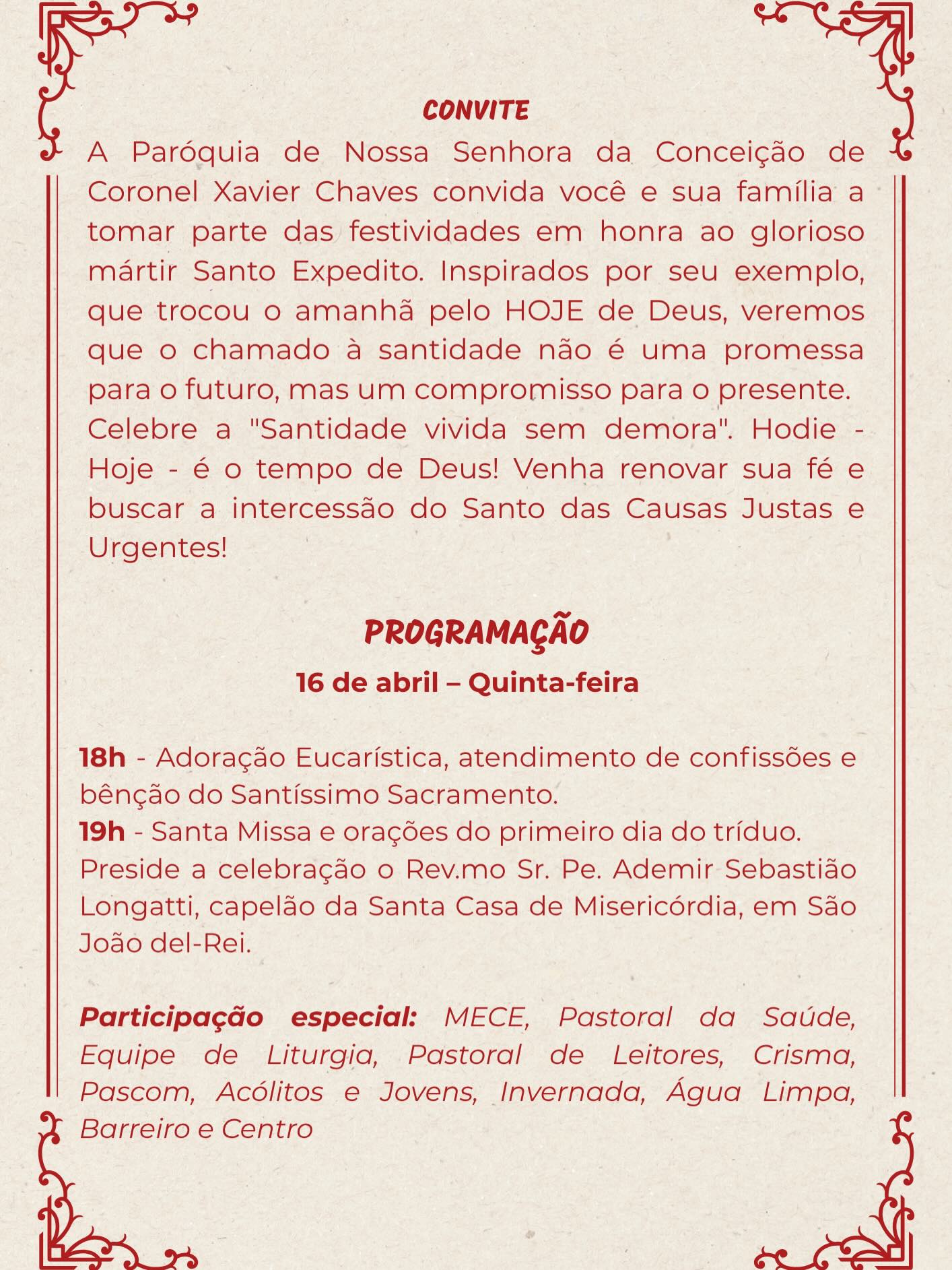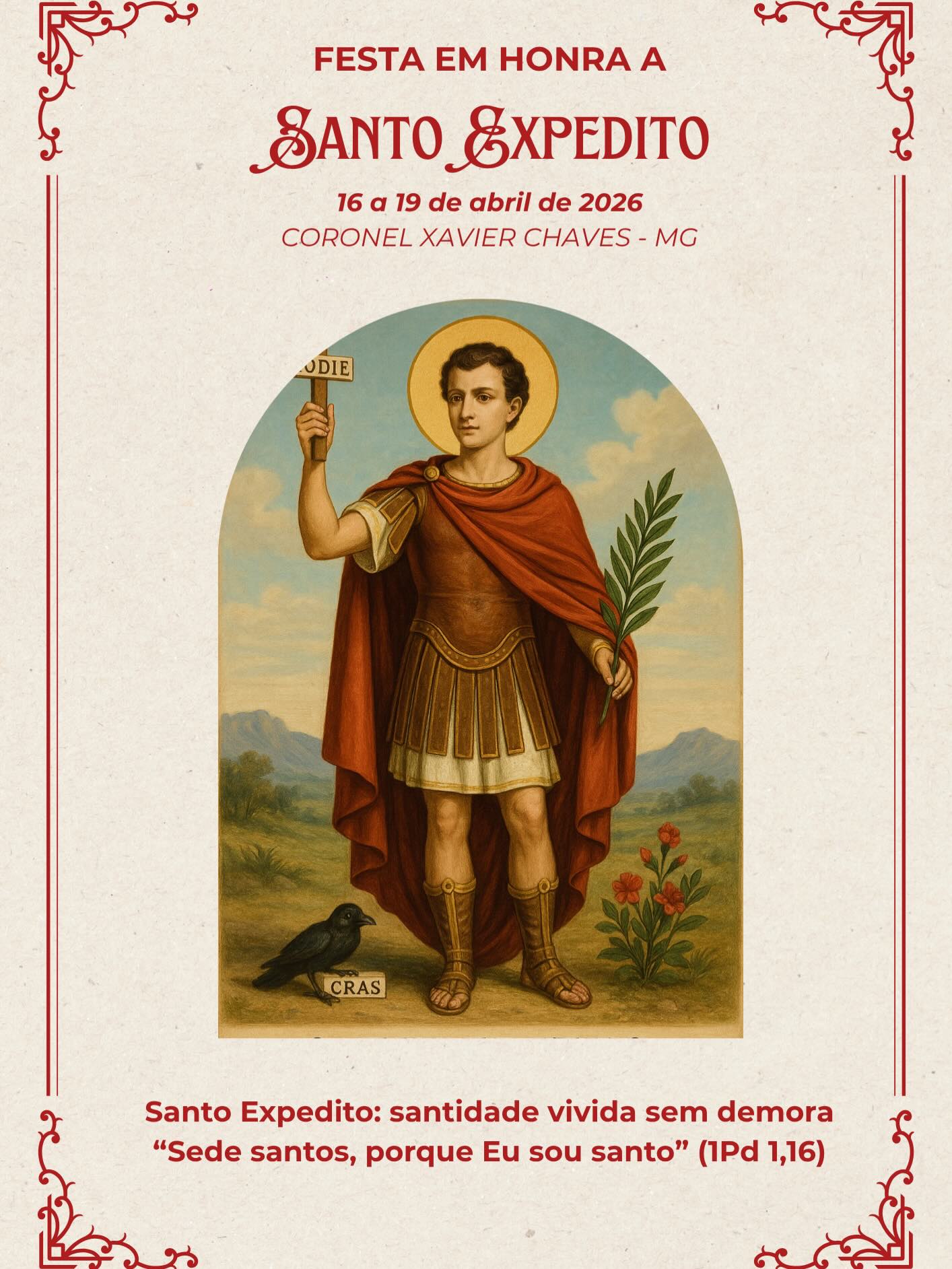 Emprego, saúde, família e casamento, esses são alguns dos pedidos mais recorrentes a Santo Expedito, aclamado nas causas justas e urgentes. Em Coronel Xavier Chaves, a festa dedicada ao santo tem início nesta quinta-feira, 16, com as orações do tríduo preparatório. No domingo, 19, dia maior da festa, haverá missa e procissão.