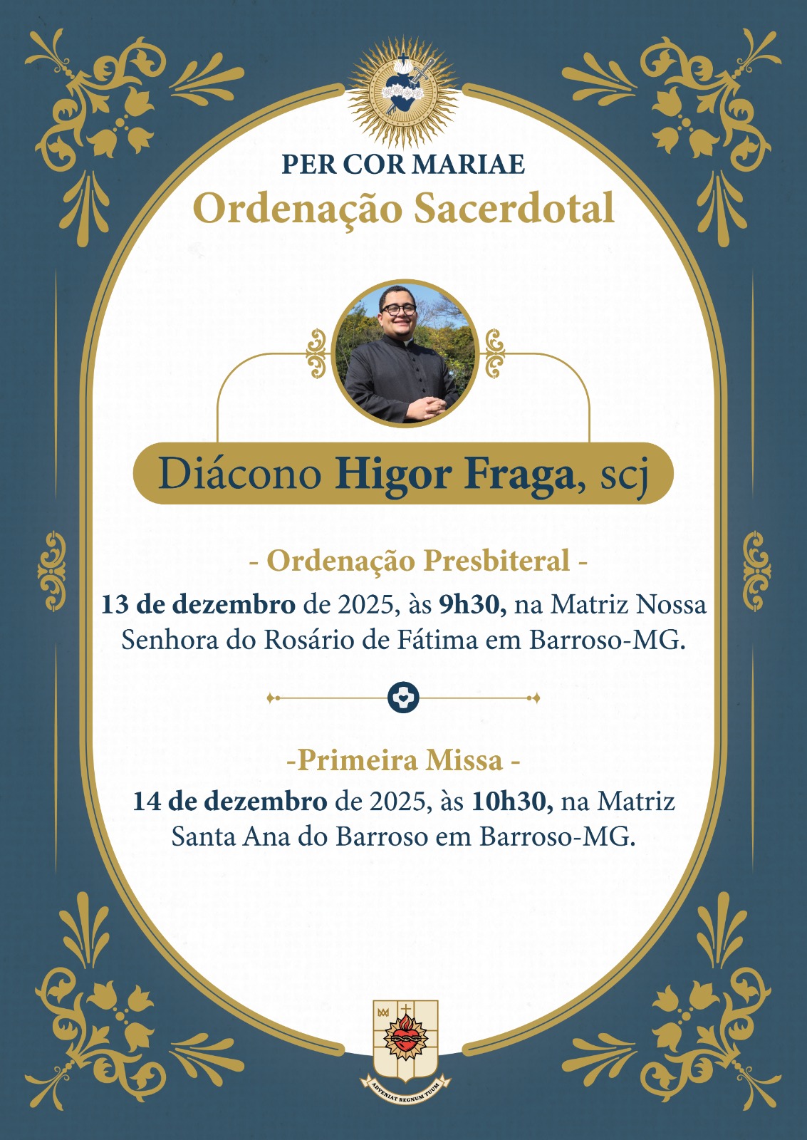 A Congregação dos Padres do Sagrado Coração de Jesus, conhecidos como Dehonianos, vai ganhar um novo presbítero na manhã deste sábado, 13. Pela imposição das mãos de Dom Dirceu de Oliveira Medeiros, bispo diocesano de Camaçari, Higor Fraga, SCJ, será ordenado para o segundo grau do sacramento da Ordem. Com o coração alegre, grato e esperançoso, o jovem Higor será ordenado depois de uma caminhada de formação, oração e discernimento. A celebração vai acontecer na igreja matriz de Nossa Senhora do Rosário de Fátima, em Barroso, às 09:30 horas.