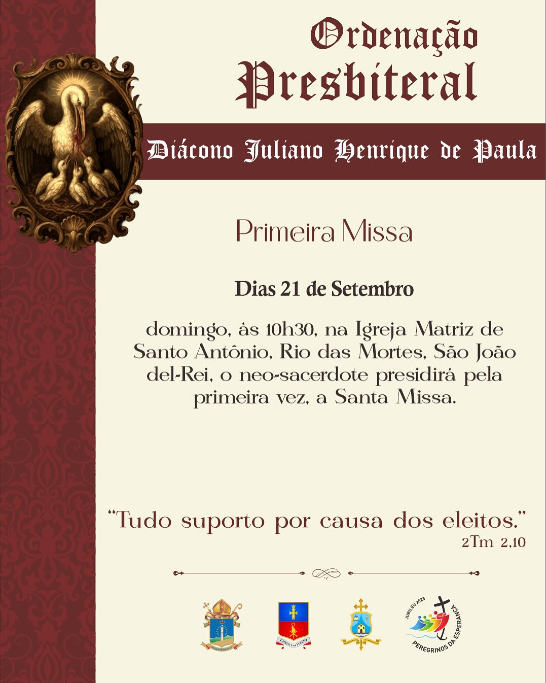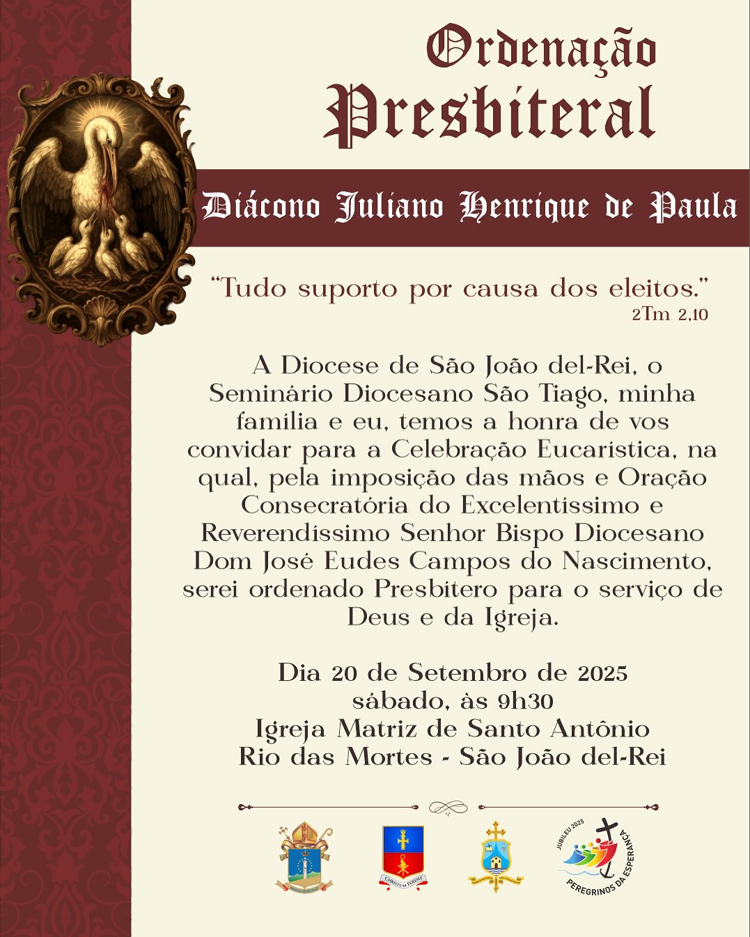 A Diocese de São João del-Rei vai ganhar um novo sacerdote para seu clero no próximo sábado, dia 20, quando o Diácono Juliano Henrique de Paula, pela imposição das mãos de Dom José Eudes Campos do Nascimento, será ordenado presbítero pelo Sacramento da Ordem. A celebração vai acontecer às 09h30, na Matriz de Santo Antônio e Beata Nhá Chica, no Distrito do Rio das Mortes.