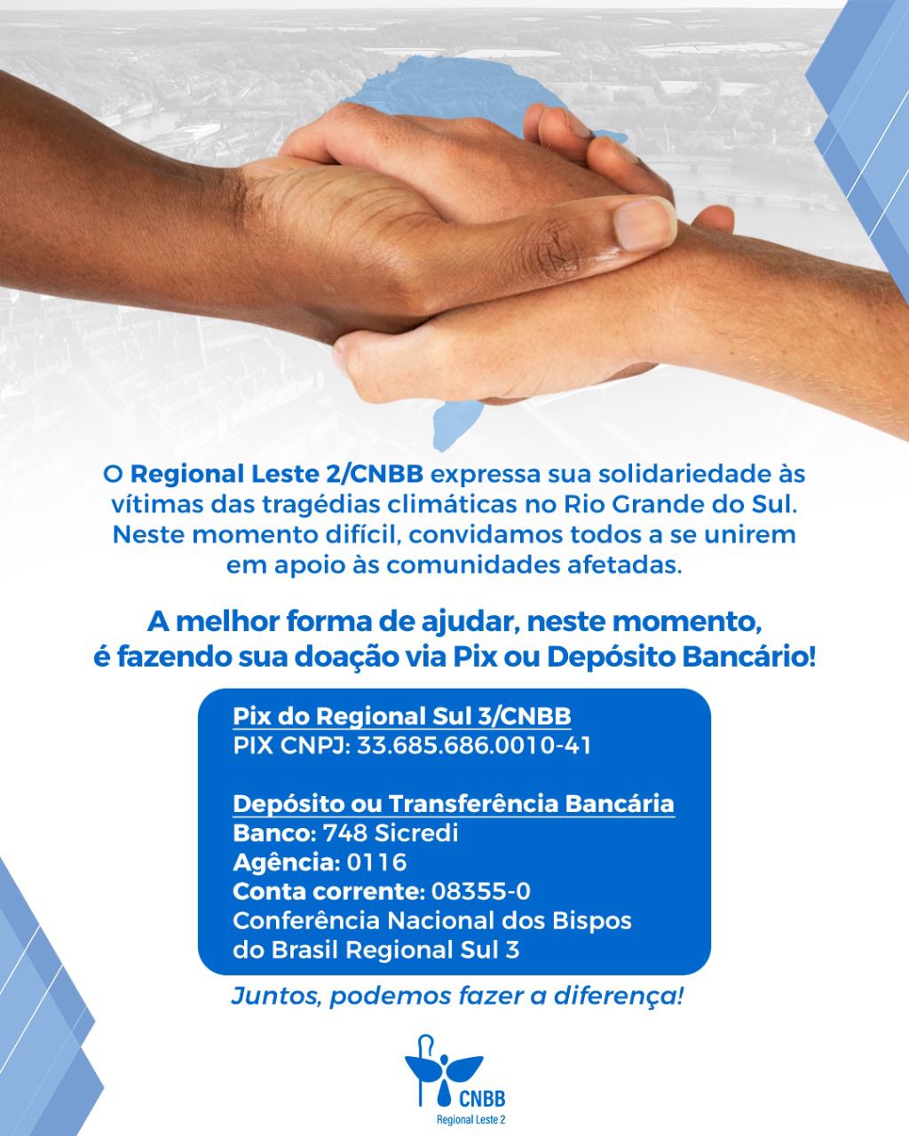 Diante da tragédia crescente causada pelas chuvas no Rio Grande do Sul e se solidarizando com as vítimas, o bispo diocesano de São João del-Rei, Dom José Eudes Campos do Nascimento, emitiu uma carta ao povo de Deus convocando a todos para se unirem em apoio e em orações às comunidades afetadas, pois a ajuda é essencial para oferecer conforto e esperança aos que mais necessitam. A Diocese de São João del-Rei encaminha sua colaboração e incentiva as doações através das contas do Regional Sul 3, da CNBB.