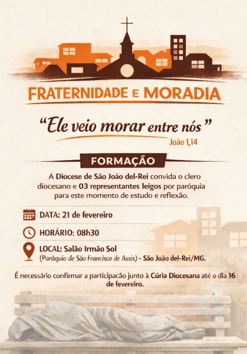 Em pleno período quaresmal a CNBB propõe aos católicos brasileiros a Campanha da Fraternidade, na busca de chamar a atenção e proporcionar uma reflexão sobre uma situação que, na sociedade, necessita de conversão, em vista do bem de todos. Para refletir sobre a Fraternidade e Moradia, a Diocese de São João del-Rei vai promover no dia 21 de fevereiro uma formação para clero e leigos sobre a Campanha da Fraternidade e a proposta de trabalho para 2026. O evento vai acontecer no Salão Irmão Sol, em São João del-Rei, e os interessados podem se inscrever até a segunda-feira, 16, sendo eles padres e 03 representantes de cada paróquia.