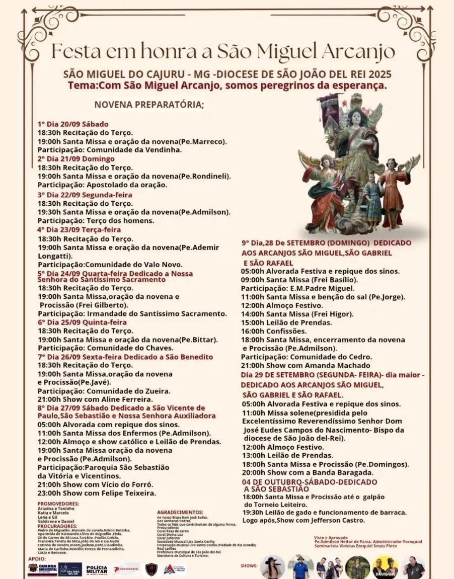 Situado há 36 km do município mineiro de São João del-Rei, o Distrito de São Miguel do Cajuru inicia neste sábado, 20, o novenário em honra ao padroeiro. O ápice das celebrações será na segunda-feira, dia 29, com uma programação especial.