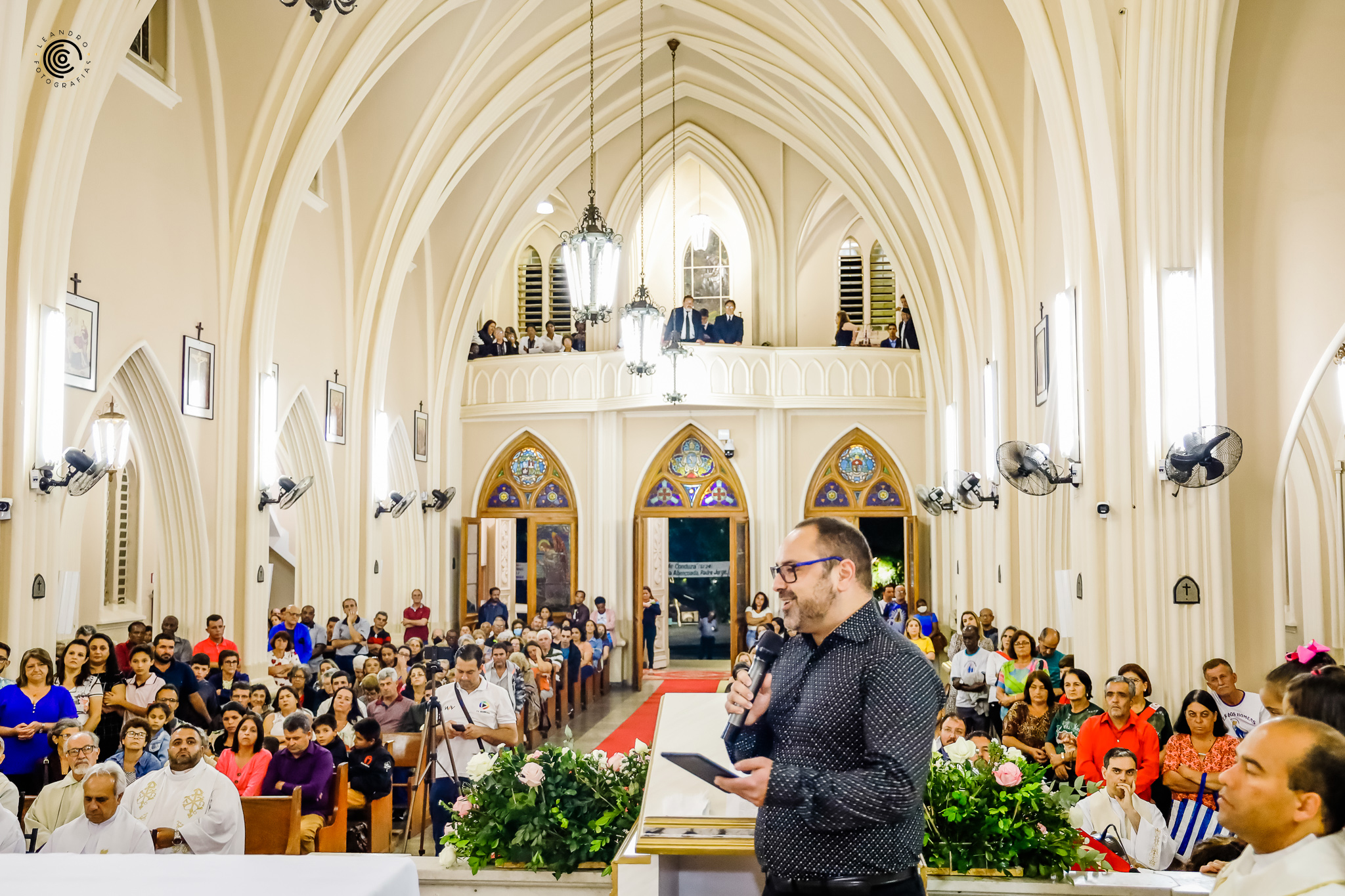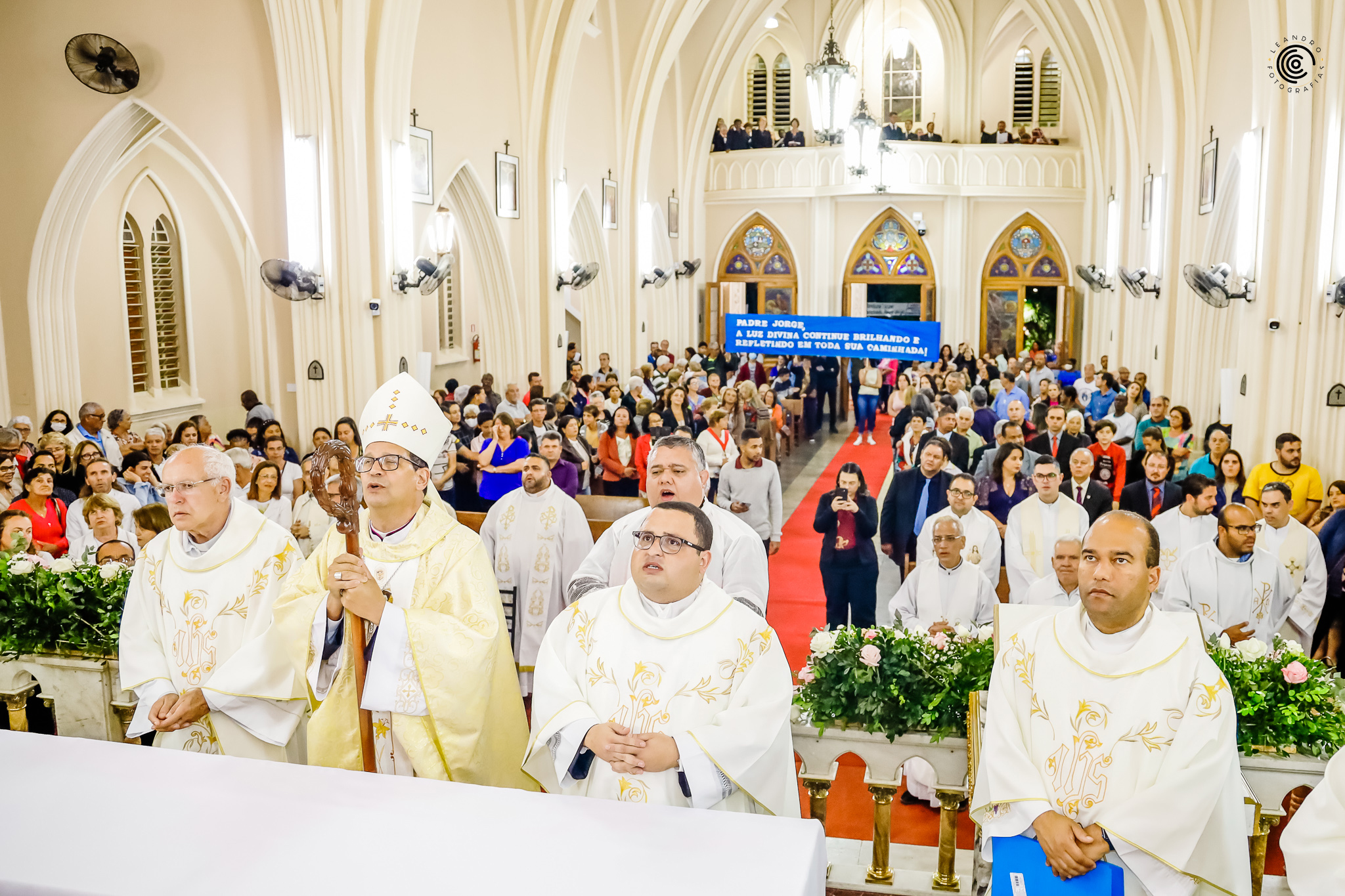 Com o templo repleto de fiéis, familiares e amigos, Padre Jorge foi acolhido pelas crianças da catequese com uma bela homenagem. Logo no início da missa – que contou, ainda, com a presença de diversos padres da região – o Chanceler do Bispado, Padre Álisson André Sacramento, fez a leitura da provisão canônica. Padre Jorge também fez sua profissão de fé e, tocando o Evangelho, fez o juramento de fidelidade ao bispo e a Igreja.
