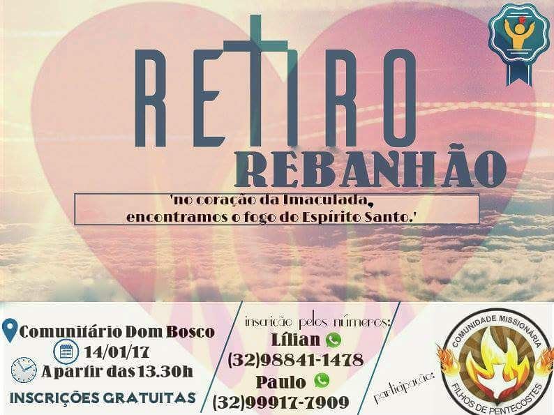 Com o objetivo de levar as pessoas a um encontro pessoal com o Espírito Santo através do Imaculado Coração de Maria, a Comunidade Missionária Filhos de Pentecostes, promove no domingo, 14, o “Retiro Rebanhão”. O evento será realizado no Comunitário Dom Bosco e tem previsão de início para às 13h30.