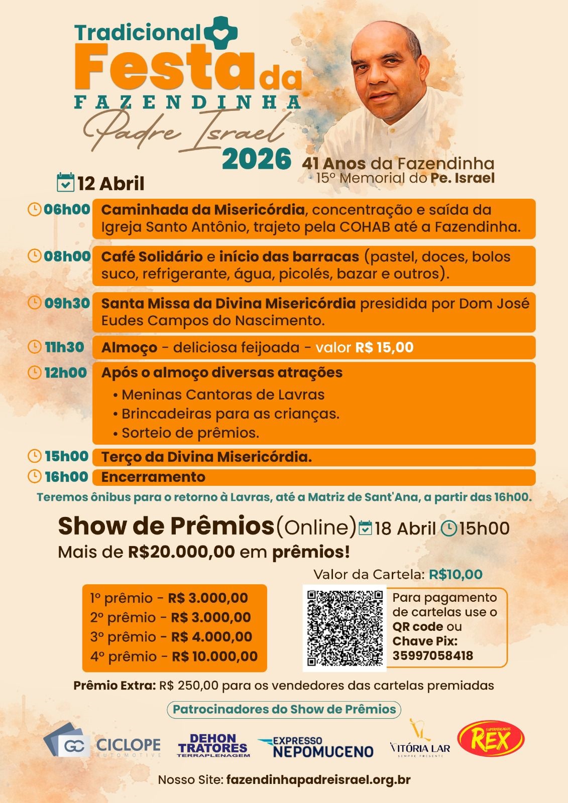 A Fazendinha do Padre Israel convida toda a comunidade lavrense e região para a 15ª Festa Memorial do patrono, Padre Israel. O evento vai acontecer no segundo domingo do mês de abril, dia 12, e vai contar com Caminhada da Fé, oração do Santo Terço, Santa Missa e uma deliciosa Feijoada por apenas R$15,00. A programação segue até o dia 18 com de Show de Prêmios. O sorteio vai ser realizado online e o valor da cartela é de 10 reais, com um total de 20 mil reais em premiações, sendo dois prêmios de 3 mil reais, um de 4 mil reais e um de 10 mil reais.