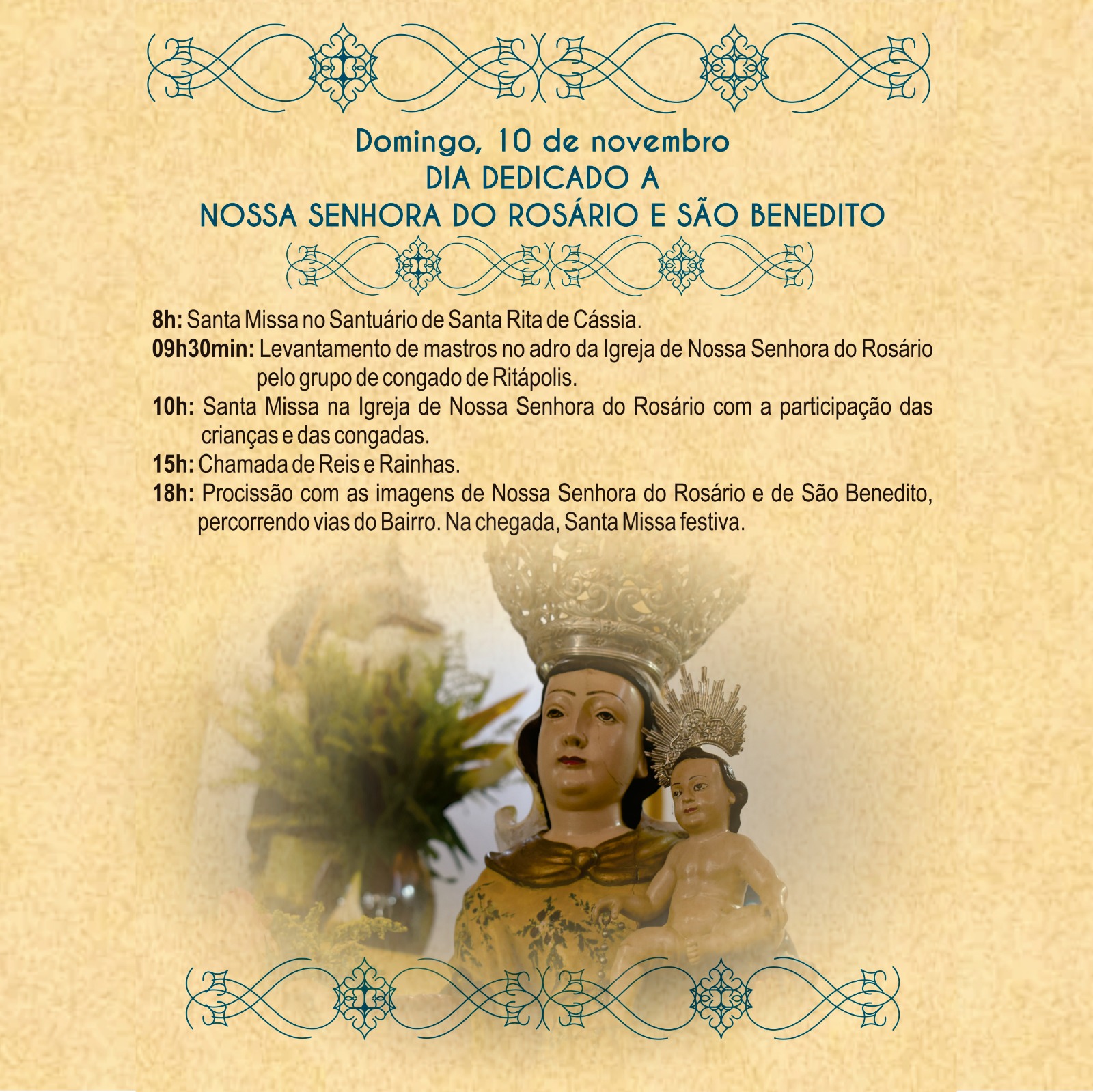 Com o tema “Maria, ensina-nos a rezar” a Paróquia Santa Rita de Cássia, da cidade de Ritápolis, inicia a partir desta quinta-feira, 07, as festividades em honra a Nossa Senhora do Rosário e São Benedito. Com grande participação de público, centenas de pessoas devem prestar suas homenagens, orações e agradecimentos a Virgem Maria, sob o título de Rainha do Rosário.
