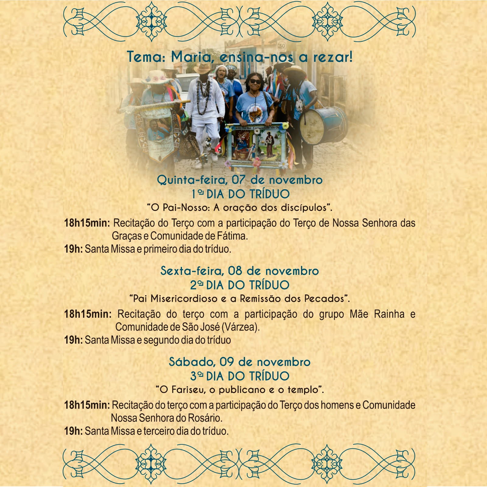A programação conta com Tríduo preparatório, celebrações de missas, apresentações culturais e procissão, além de contar com a participação de grupos de Congado, com seu colorido, batuque, cantorias e danças.