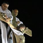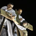A lua já seguia alta quando, aos poucos, placa, coroa de espinhos e cravos eram retirados da imagem de Cristo na cruz. Interpretando José de Arimatéia e Nicodemos, os padres Geraldo Magela e Álisson Sacramento retiravam os objetos no comando do pregador.