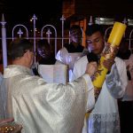 A celebração inicia-se fora do templo, onde o sacerdote abençoa o fogo e acende uma grande vela chamada de Círio Pascal, que representa Cristo, a luz do mundo. Os fiéis acendem suas velas no Círio e caminham, em procissão, para o interior da igreja, onde se canta a “Proclamação da Páscoa”.