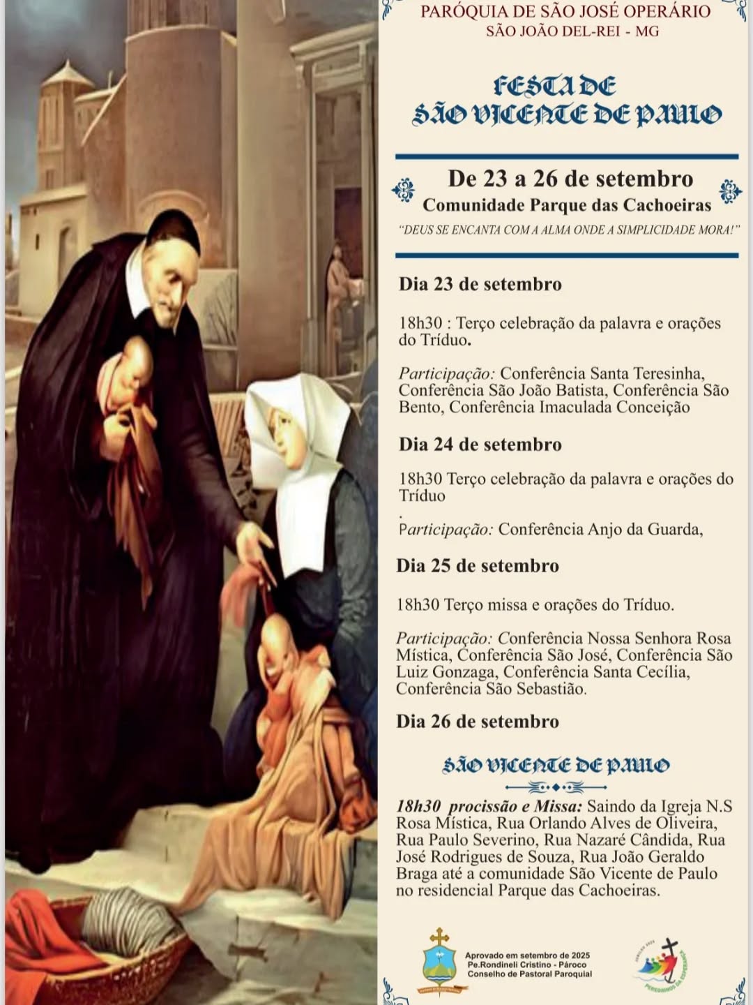 Tem início nesta terça-feira, 23, mais uma festa religiosa em São João del-Rei. Dessa vez, a Comunidade Parque das Cachoeiras, da Paróquia São José Operário, presta uma homenagem à São Vicente de Paulo. A programação segue até sexta-feira, 26.