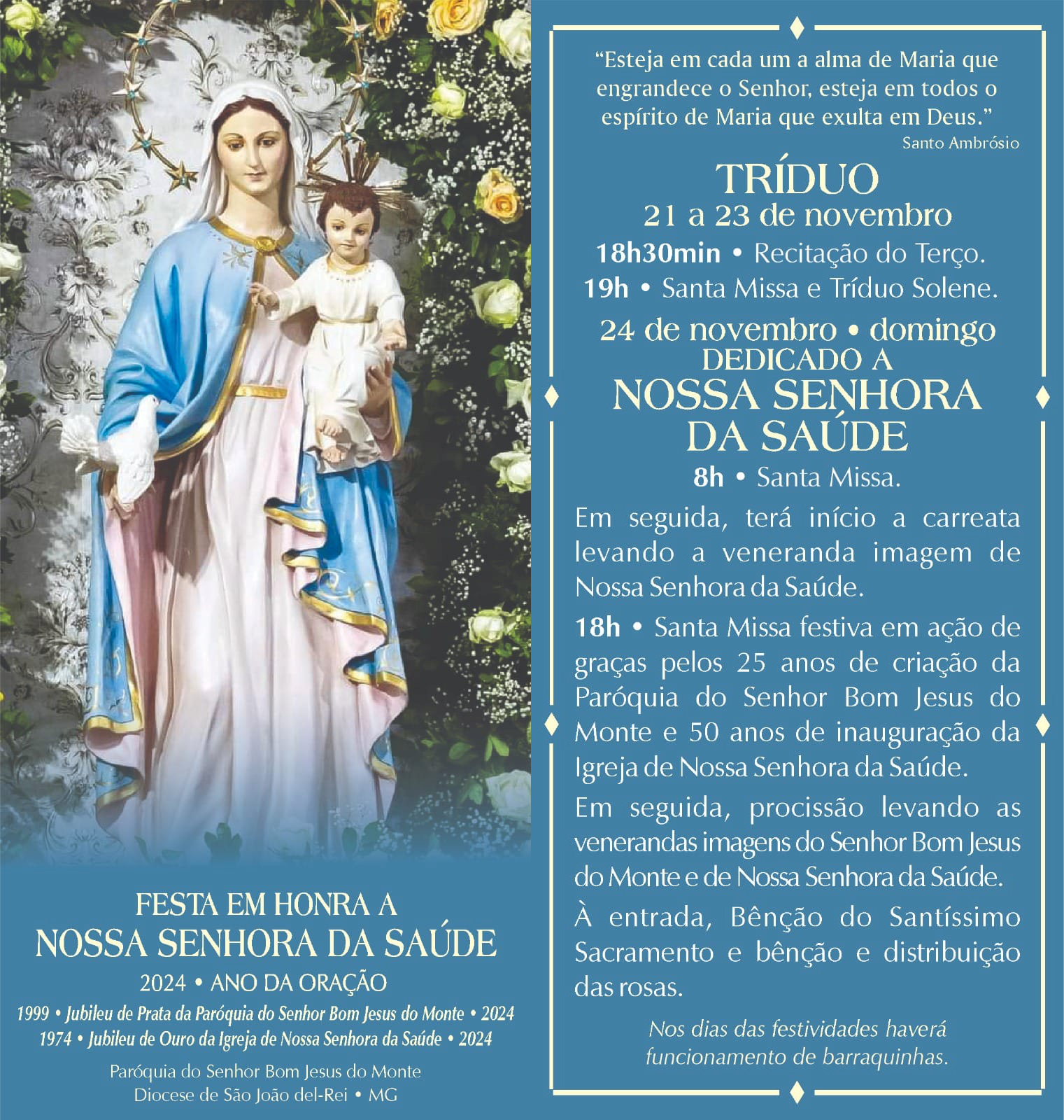 A Paróquia Senhor Bom Jesus do Monte, em São João del-Rei, deu inicio nesta quinta-feira, 21, a festa em honra a Nossa Senhora da Saúde. Até sábado, dia 23, haverá recitação do terço, celebrações de missas e Tríduo Solene, às 18h30. No domingo, 24, dia maior da festa, vai haver Santa Missa às 08h, em seguida, carreata levando a veneranda imagem de Nossa Senhora da Saúde pelas ruas da comunidade. Já às 18 horas vai acontecer a Santa Missa festiva, seguida de procissão. À entrada, Bênção do Santíssimo Sacramento e bênção e distribuição das rosas.