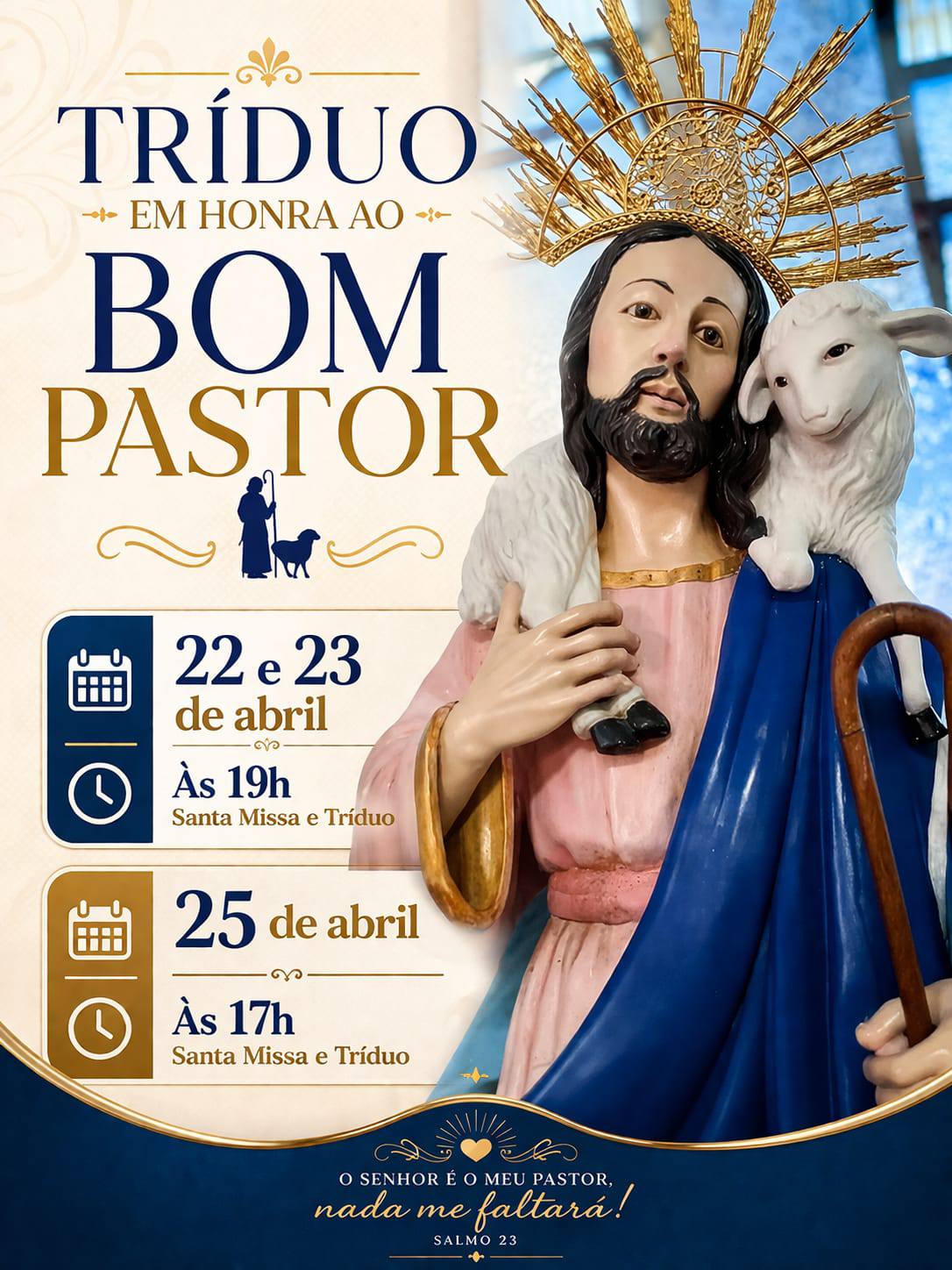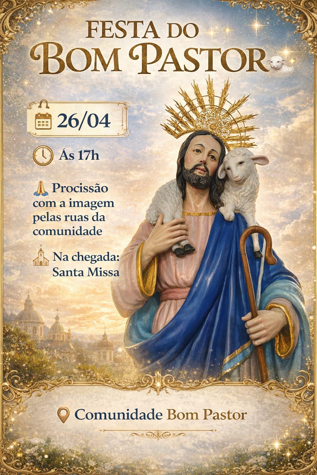 A Igreja Católica celebra no Quarto Domingo da Páscoa o dia do Bom Pastor. Este ano a data será festejada no próximo domingo, dia 26. Na Paróquia Menino Jesus de Praga a programação começa nesta quinta-feira, 23, com missa e tríduo preparatório. O ápice da programação será no domingo com procissão e missa no Alto do Cruzeiro Luminoso.