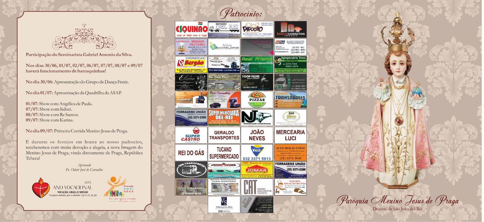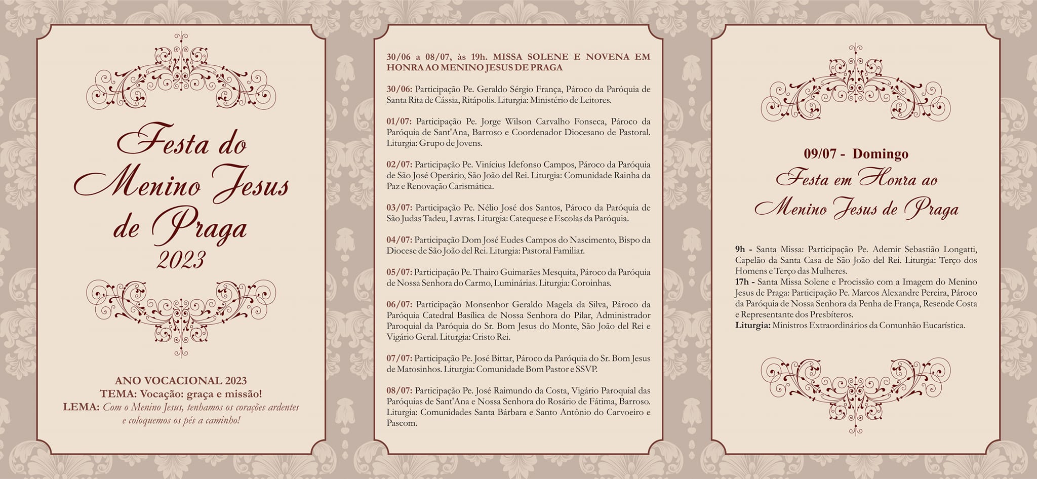 Tem início na próxima sexta-feira, 30, as festividades em honra ao Menino Jesus de Praga, na Paróquia localizada no bairro Pio XII, em São João del-Rei. Este ano a festa tem como tema “Vocação, graça e missão” e como lema “Com o Menino Jesus, tenhamos os corações ardentes e coloquemos os pés em caminho”, remetendo a celebração do ano vocacional. O ápice da programação será no domingo, dia 09.