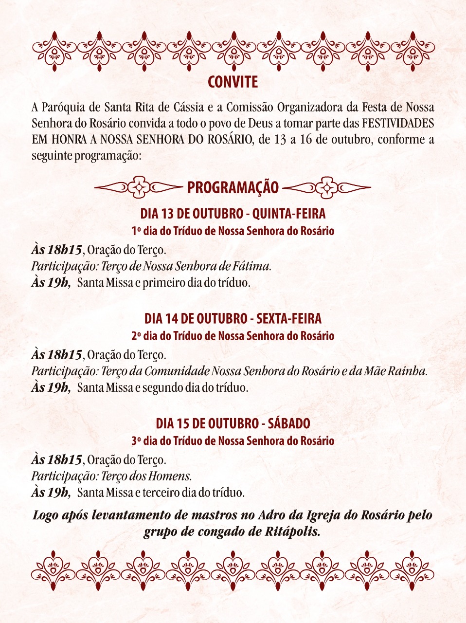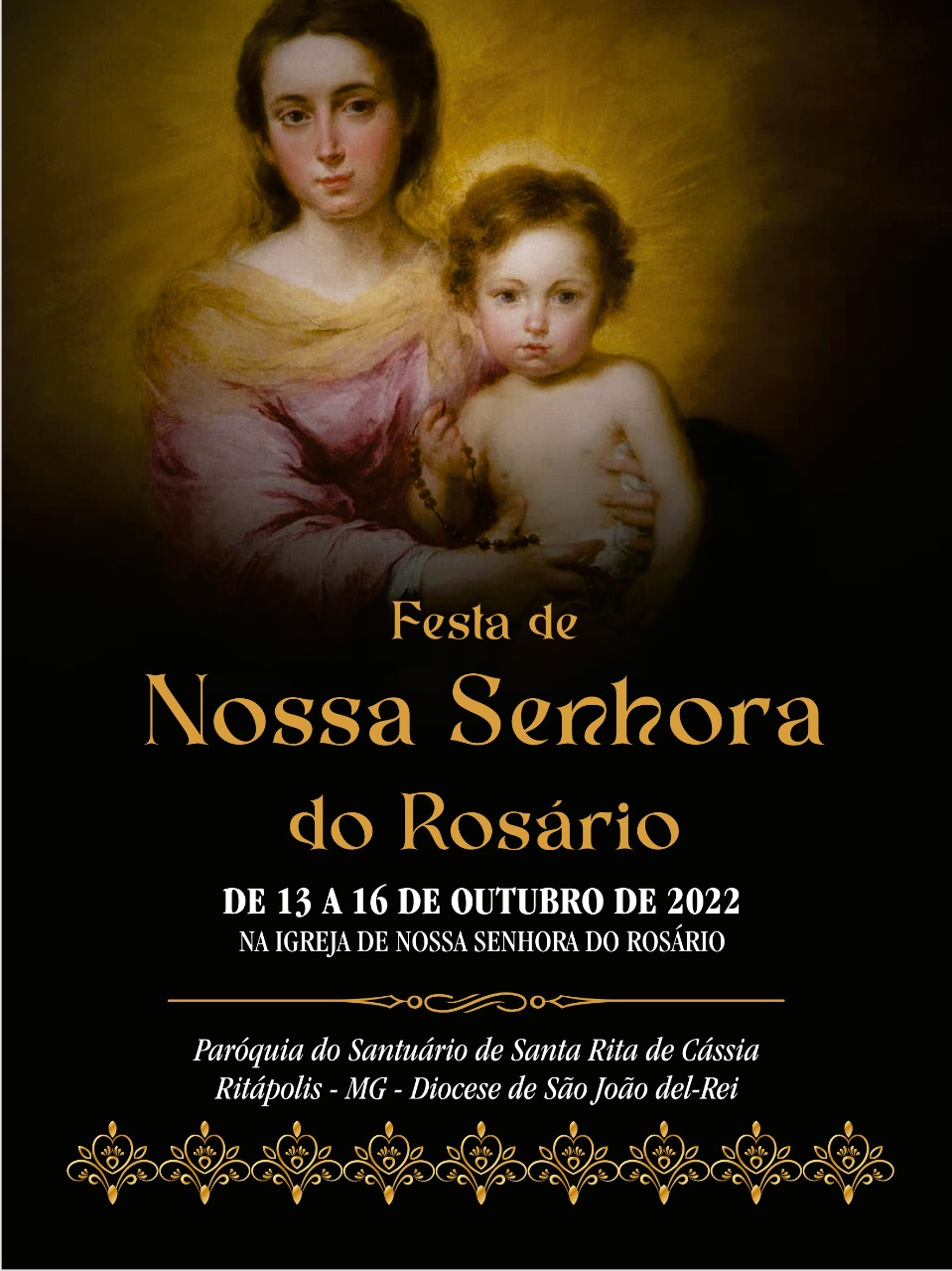 O Rosário é uma oração contemplativa e cristocêntrica. É a prece do cristão na sua peregrinação da fé, seguindo os passos de Jesus, na companhia de Maria. Na cidade de Ritápolis a festa tem início nesta quinta-feira, 13, com as orações do Tríduo Preparatório. Com imagens do século XX, a procissão está prevista para domingo, dia 16. veja a programação: