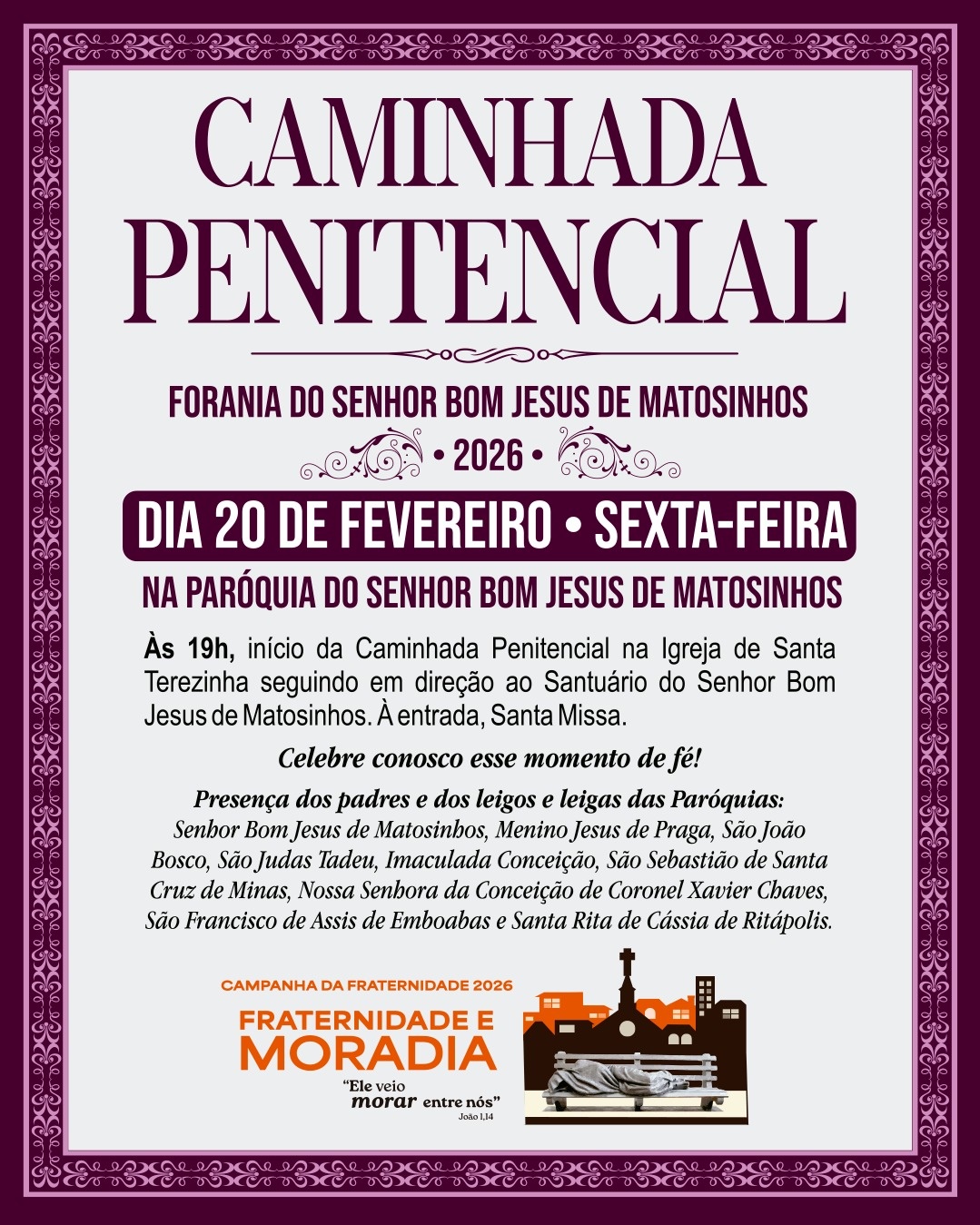 Marcada por significativas celebrações, a Quaresma permite o cristão a refazer a peregrinação pascal de Jesus Cristo e refletir o mistério da sua Paixão, Morte e Ressurreição. É por isso que a Forania Senhor Bom Jesus de Matosinhos vai realizar no sábado, 20, a primeira Caminhada Penitencial a nível fonâneo. O evento pretende reunir representantes das 08 paróquias envolvidas.