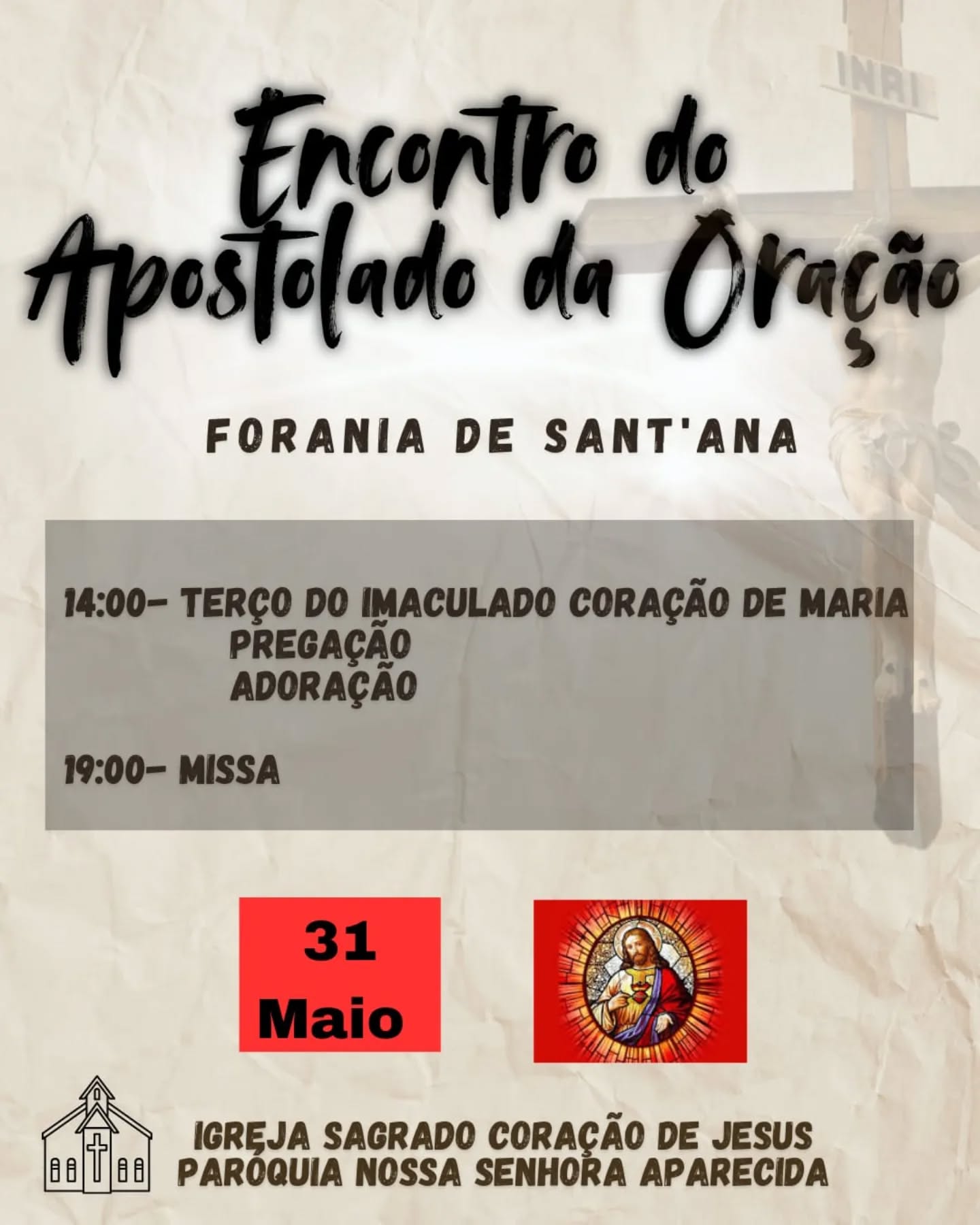 A Forania de Sant’Ana vai realizar no próximo sábado, 31, o Encontro do Apostolado da Oração. O evento vai acontecer na Igreja Sagrado Coração de Jesus, pertencente a Paróquia Nossa Senhora Aparecida, em lavras, e vai contar com momentos de oração do terço do Imaculado Coração de Maria, pregação, adoração ao Santíssimo Sacramento e Santa Missa.