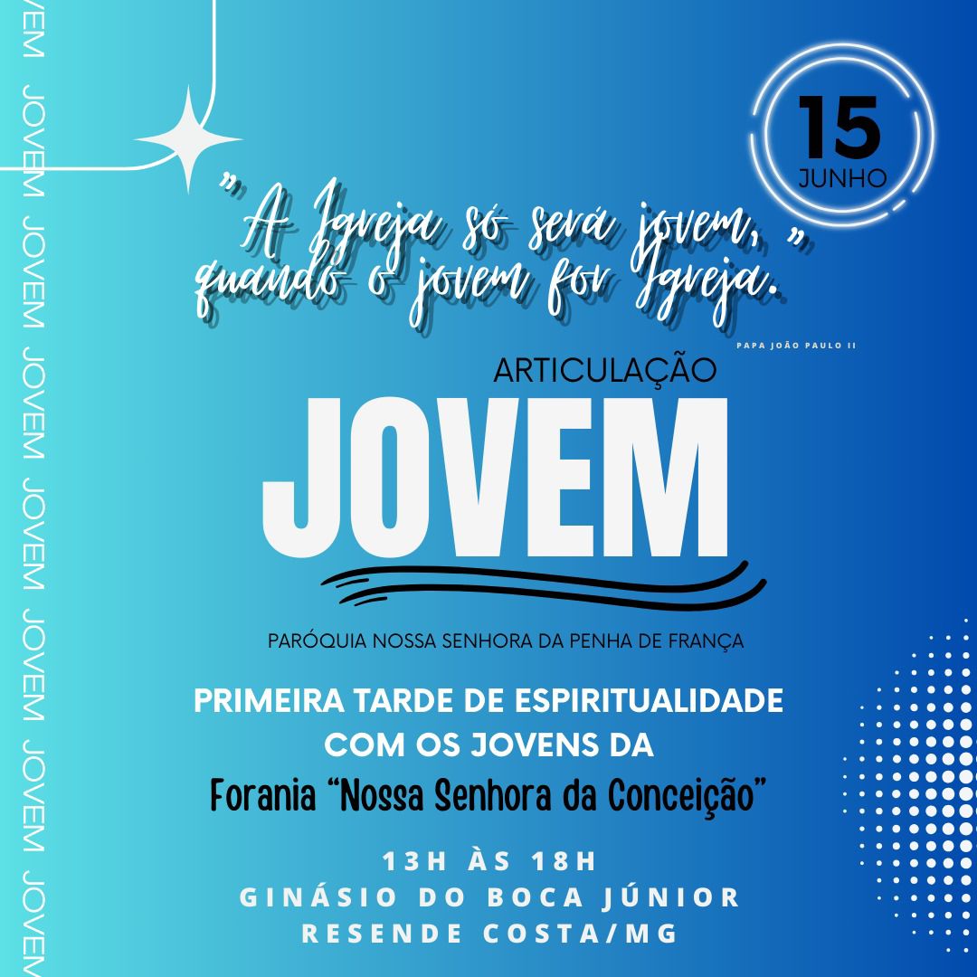 A Forania Nossa Senhora da Conceição já se organiza e articula a juventude para a 1ª Tarde de Espiritualidade da Forania, que vai acontecer neste sábado, dia 15 de junho, na Paróquia Nossa Senhora da Penha de França, em Resende Costa. O objetivo do encontro é promover uma tarde de espiritualidade, encontro e partilha de experiências, estimulando uma maior interação entre os grupos e movimentos jovens da referida forania.