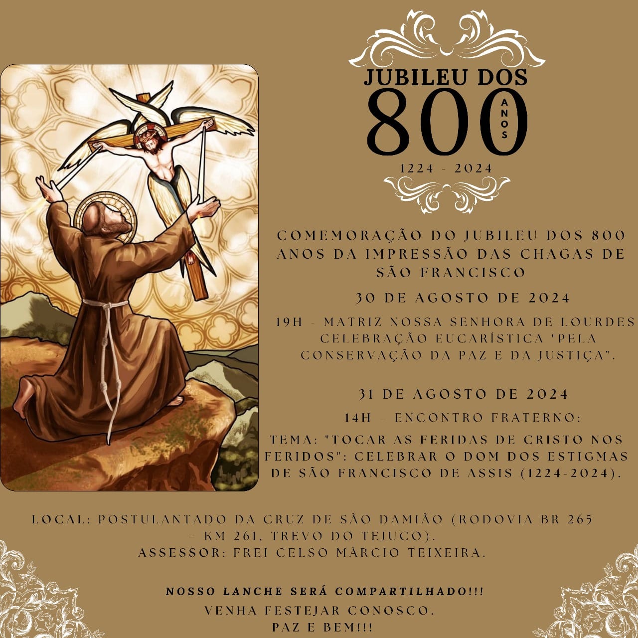 Em comunhão com a Família Franciscana, a Paróquia de São Francisco de Assis, em São João del-Rei vai dar início a celebração do jubileu dedicado aos 800 anos dos estigmas recebidos por são Francisco de Assis, em 1224, quando ele estava em jejum por 40 dias no Monte La Verna. A celebração de abertura acontece nesta sexta-feira, 30.
