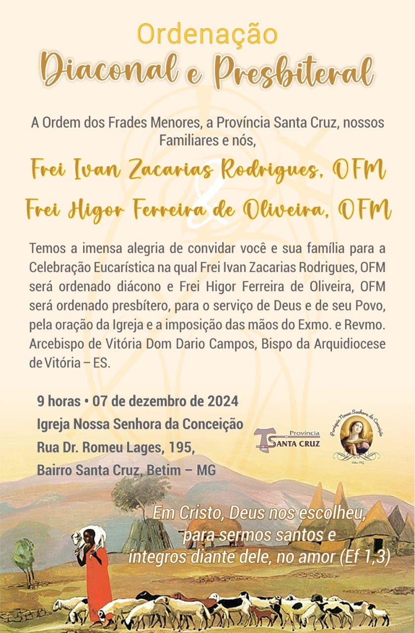 Além da ordenação presbiteral de frei Higor, a celebração também vai contar com a ordenação diaconal de Frei Ivan Zacarias Rodrigues, OFM.