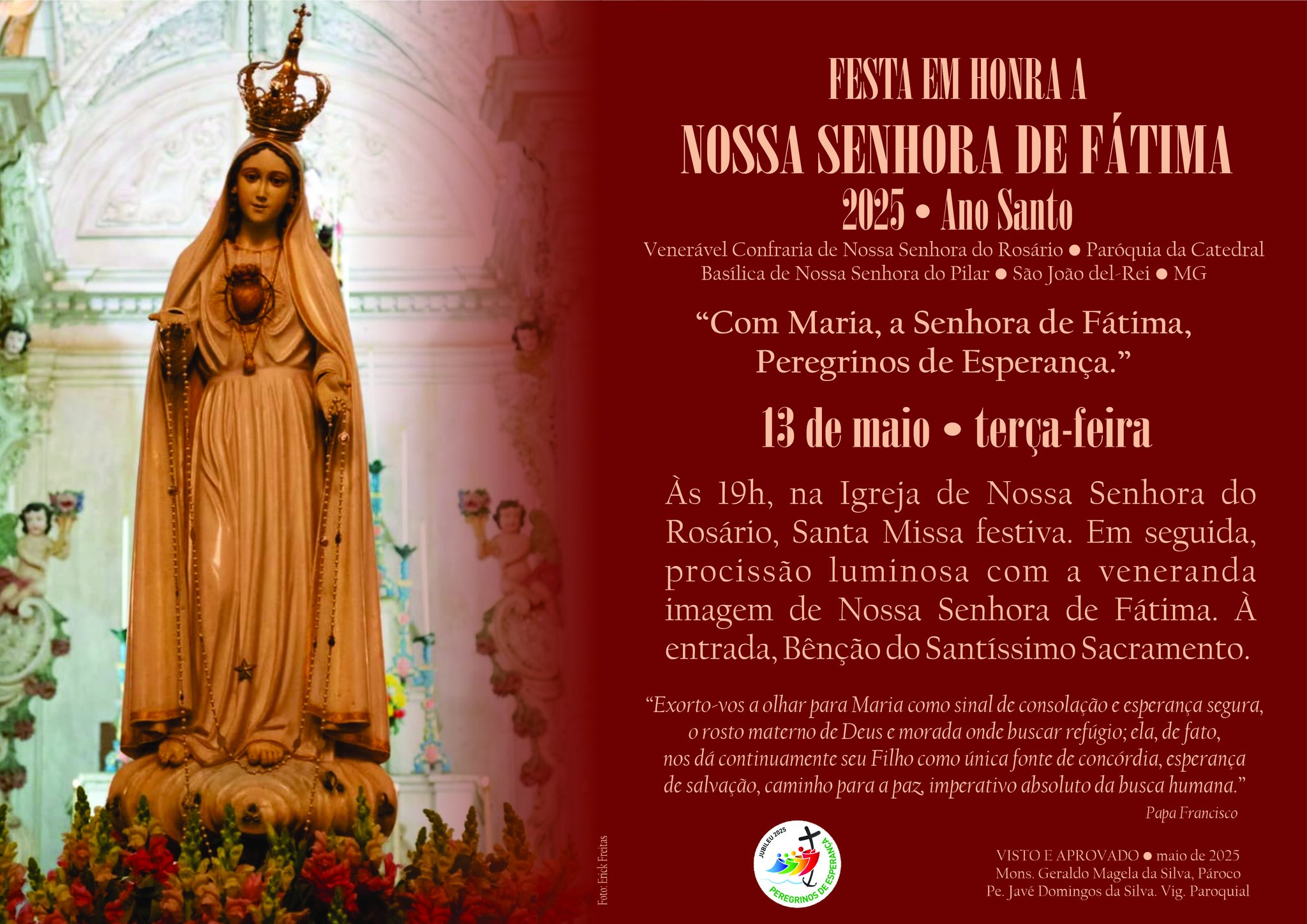 A Confraria de Nossa Senhora do Rosário celebra nesta terça-feira, 13, a festa em honra à Nossa Senhora de Fátima. Com o tema “Com Maria, a Senhora de Fátima, Peregrinos da Esperança”, a programação segue com missa festiva às 19 horas, seguida de procissão luminosa pelas ruas do centro histórico e Bênção do Santíssimo Sacramento.